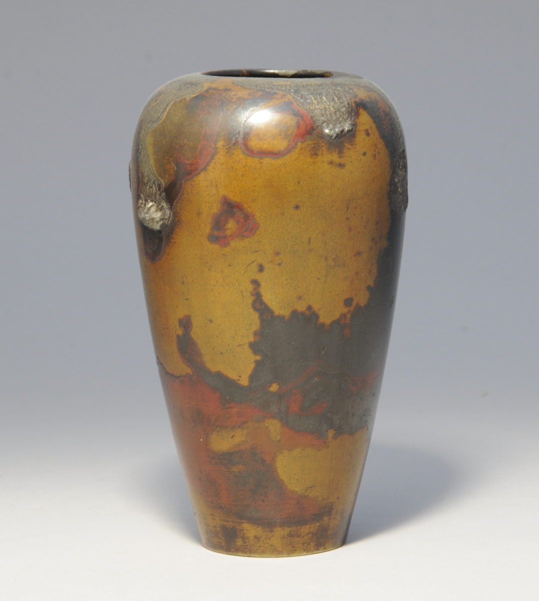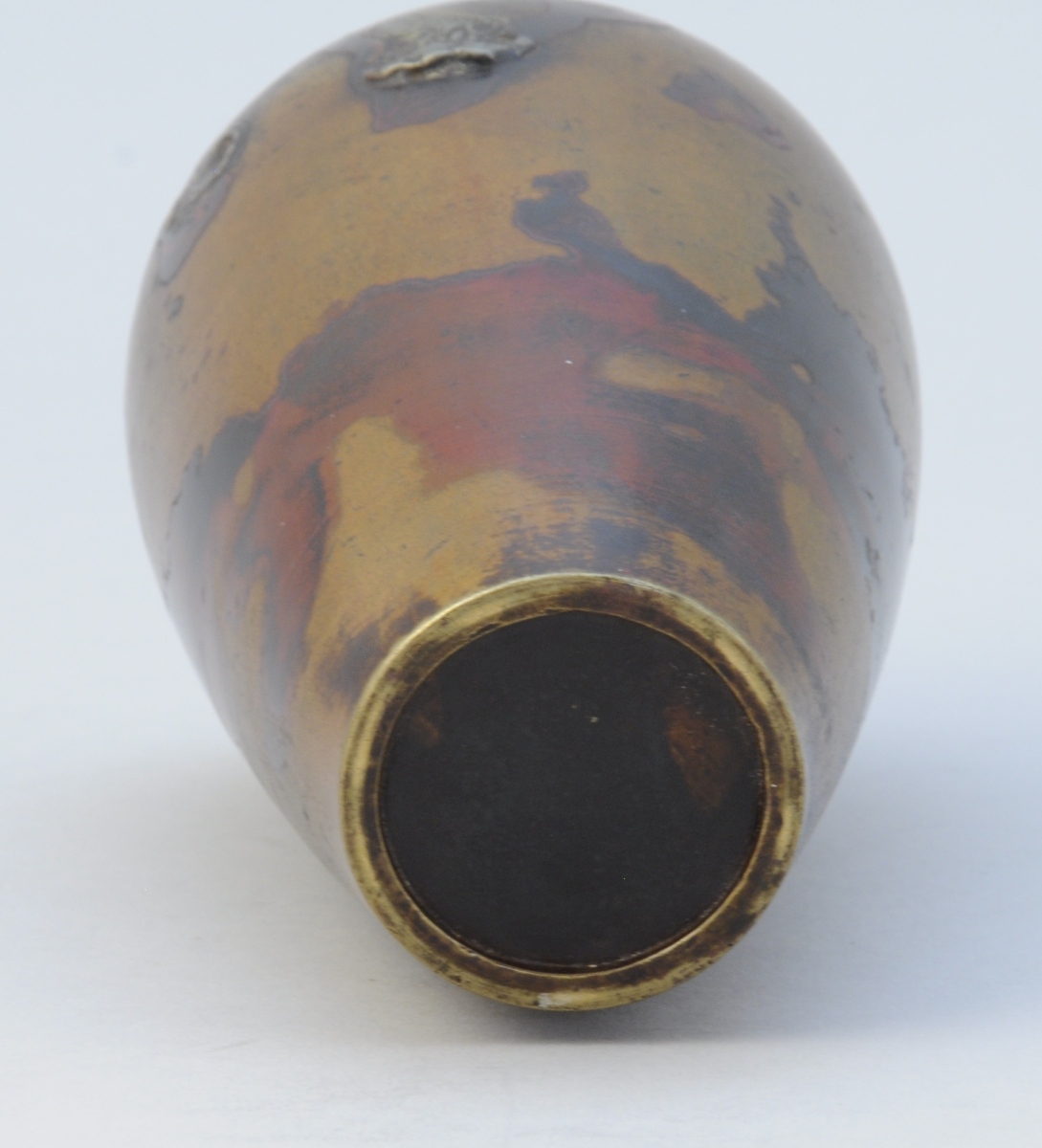 VASE de forme pansue en bronze travail à l'acide de couleur brune, ocre et rouille. Coulures en vaguelettes argentées.
