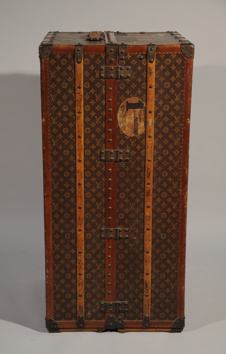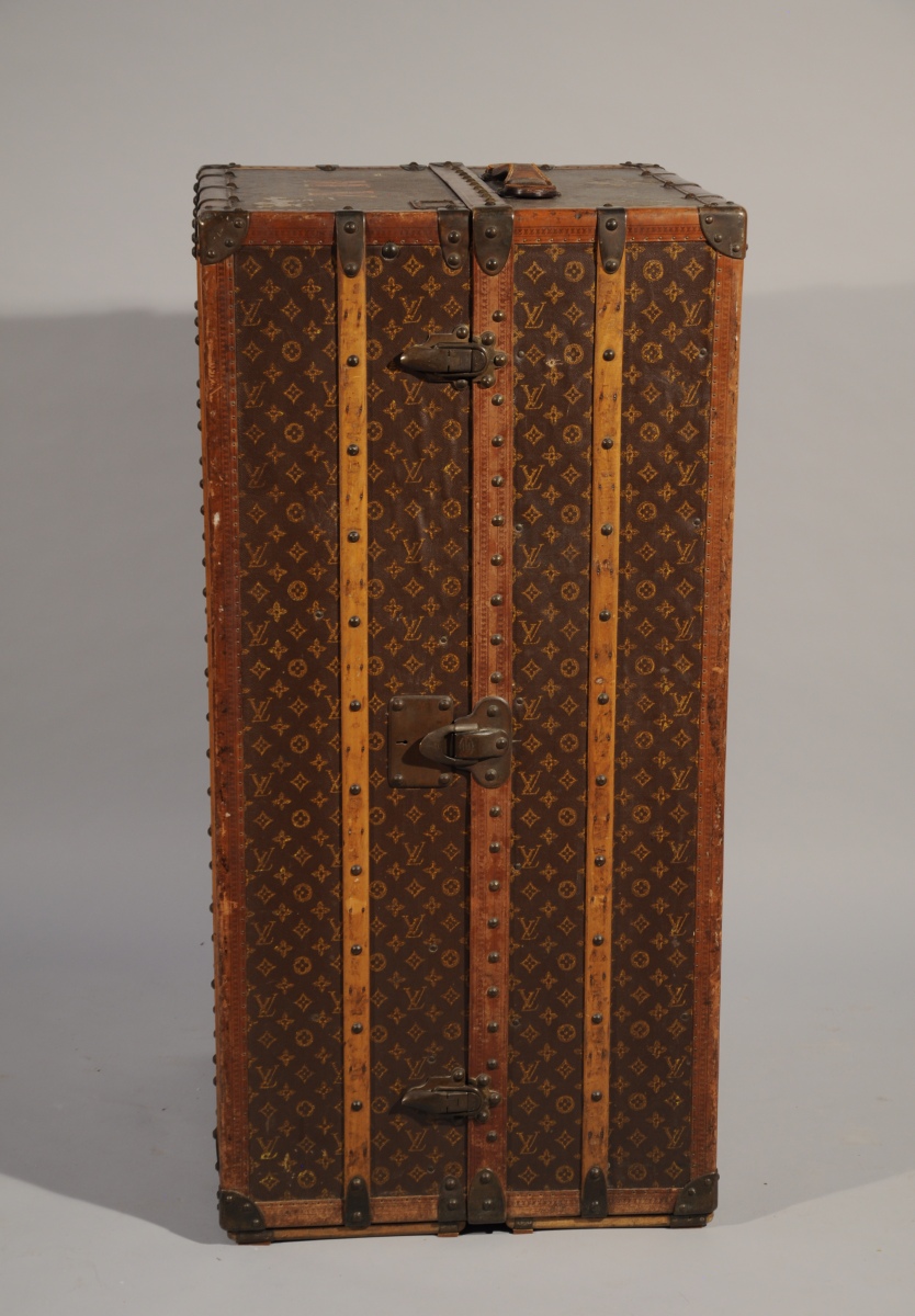 WARDROBE en toile monogrammée et renforts en hêtre. Bordures lozinées, écoinçons et fermeture en laiton doré. Poignées cuir. Intérieur doublé de vuittonite jaune-orangé ouvrant d'un côté à six tiroirs et formant penderie.