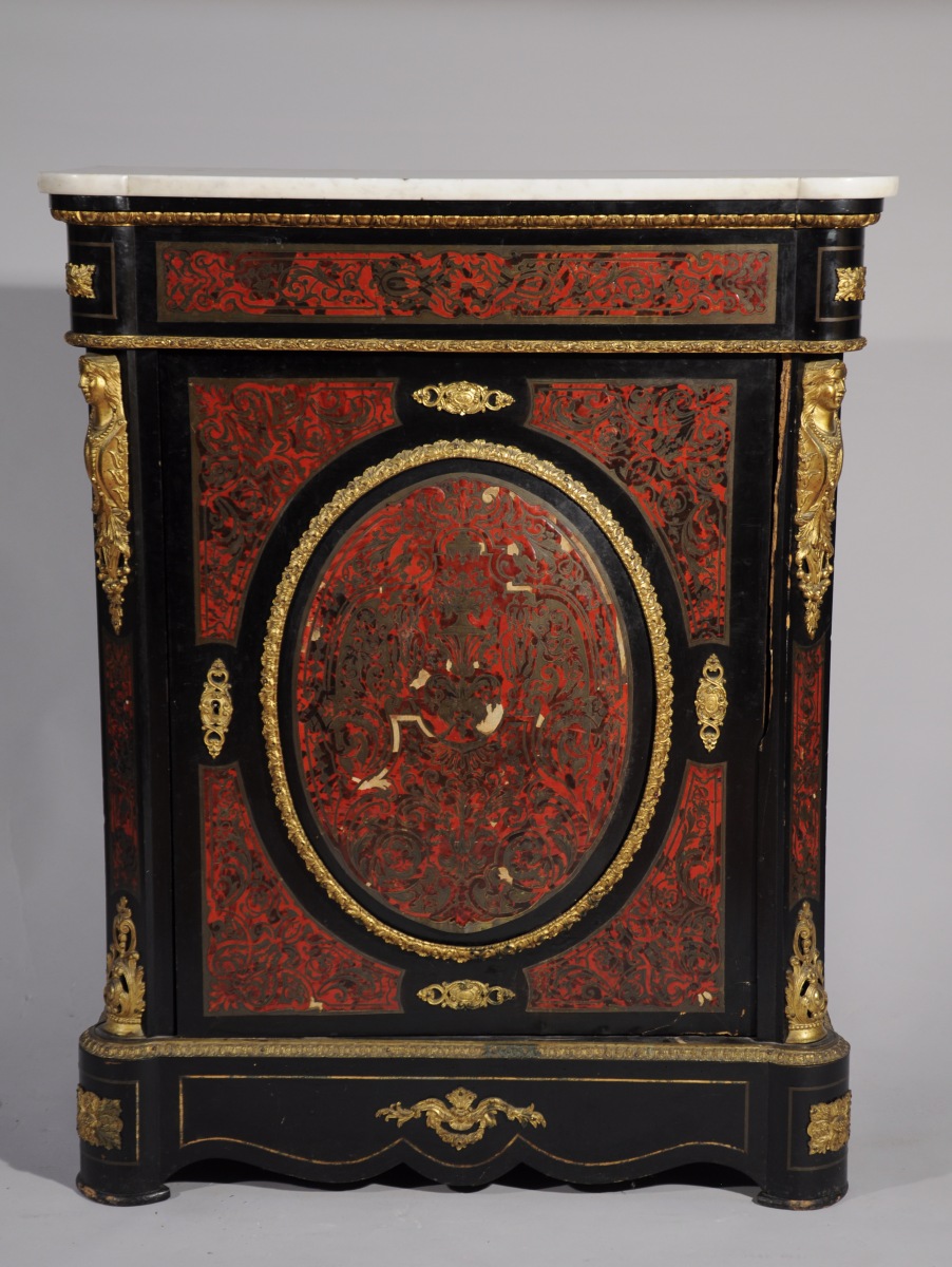 MEUBLE À HAUTEUR D'APPUI de forme rectangulaire ouvrant à une porte en façade, en bois noirci et marqueterie dite boulle en partie de laiton sur fond d'écaille. Riche décor de rinceaux à la Bérain. Garniture de bronzes ciselés et dorés tels que espagnolettes, frises, fleurons, entrée de serrure et cul-de-lampe. Traverse basse découpée. Dessus de marbre blanc.