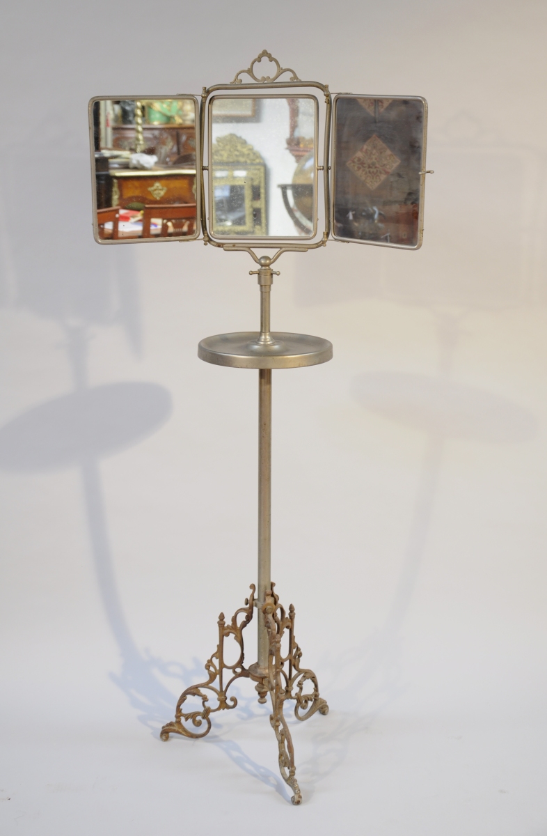 SELLETTE DE TOILETTE en métal, un miroir dépliant à trois glaces en partie supérieure. Plateau circulaire. Elle repose sur trois pieds ajourés de rinceaux.
