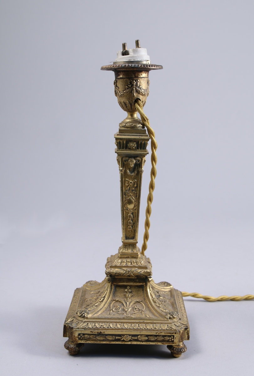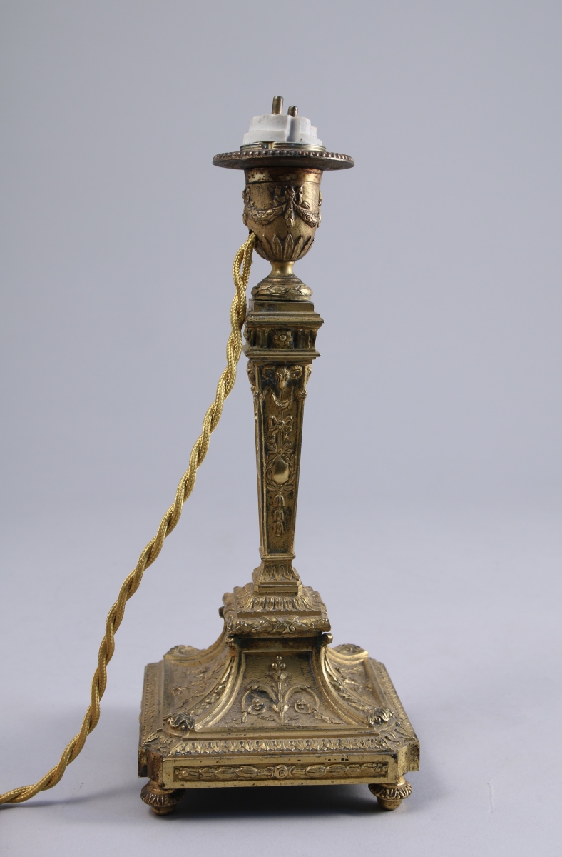Petit FLAMBEAU en bronze finement ciselé et doré. Riche décor néoclassique de rubans noués, guirlandes de feuilles, têtes de bélier, tores de lauriers, médaillons, frises de feuilles d'eau, rais de coeurs et rinceaux. Fût gaine soutenu par une base de forme carrée à quatre pans trapézoïdaux. Il repose sur quatre pieds toupie.