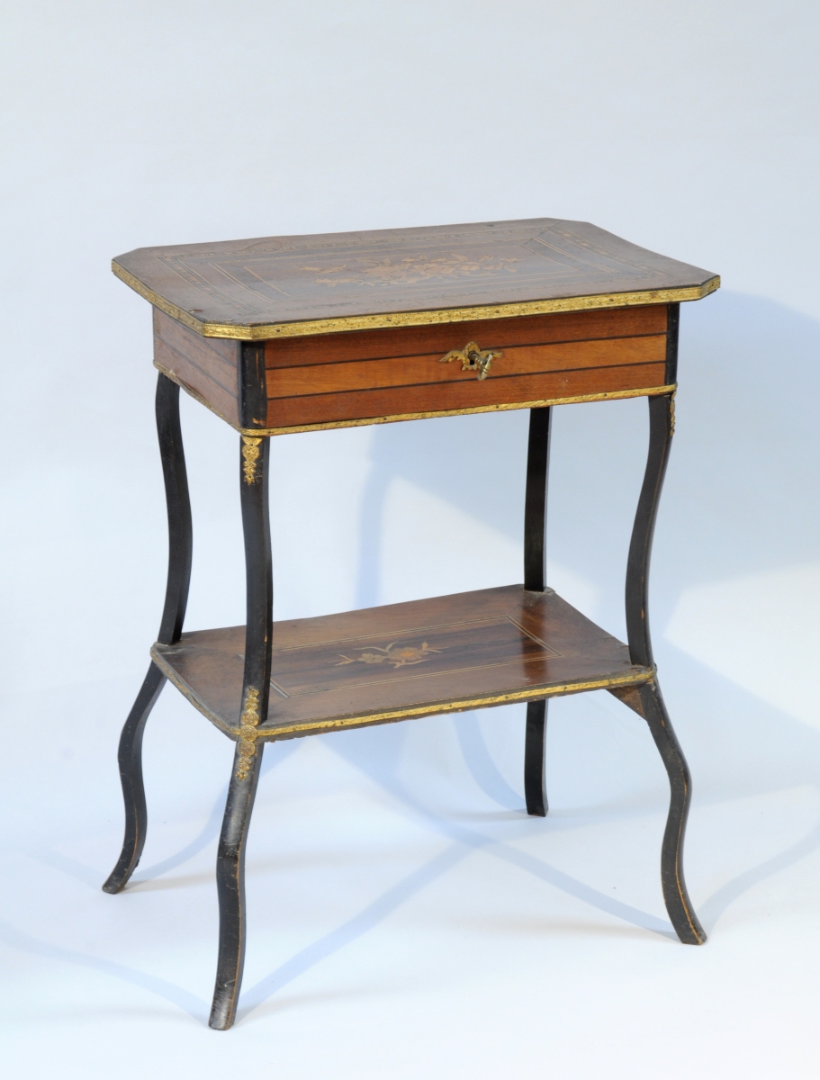 TABLE À OUVRAGE en placage de bois exotiques dont acajou et palissandre. Le plateau de forme rectangulaire à pans coupés à décor marqueté de fleurs, oiseau et filets. Foncé d'un miroir sur sa face interne, il découvre un coffre compartimenté. Il repose sur quatre pieds cambrés en bois noirci réunis par une tablette d'entretoise centrée d'une marqueterie florale. Garniture de pomponne telle que frises et chutes.