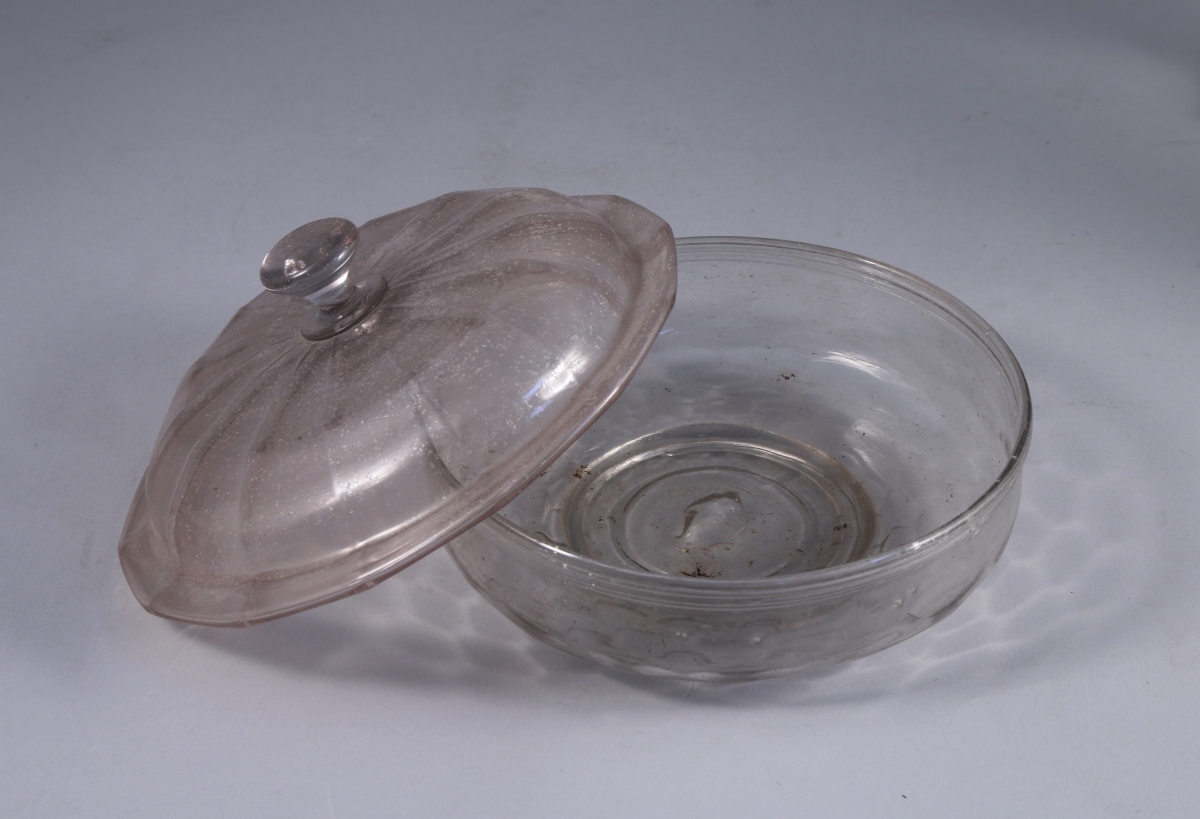 - DRAGEOIR de forme circulaire en verre soufflé transparent. Le corps à décor d'alvéoles et filets sur le col repose sur un talon. Couvercle bombé à pans orné de côtes saillantes. Prise toupie. XVIIIe. Haut. 11 cm. (couvercle probablement rapporté)