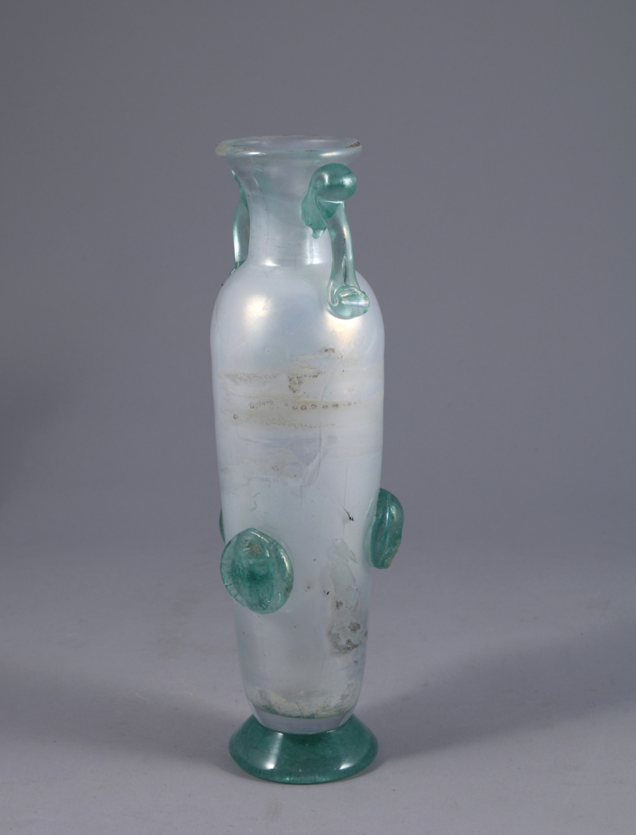 - AMPHORISQUE en verre nacré irisé. Applications de verre de couleur verte telles que : anses latérales, trois pastilles à visage humain et pied évasé.