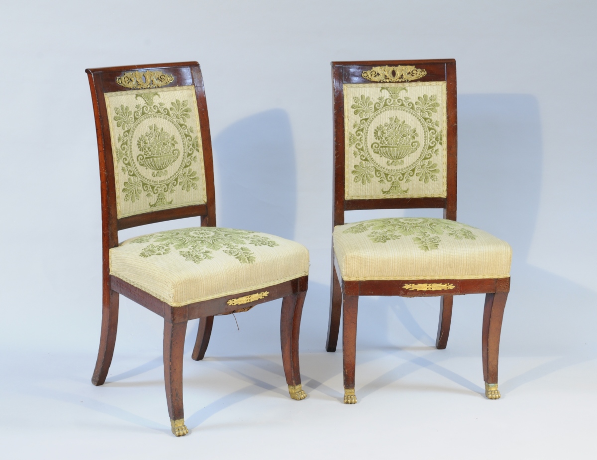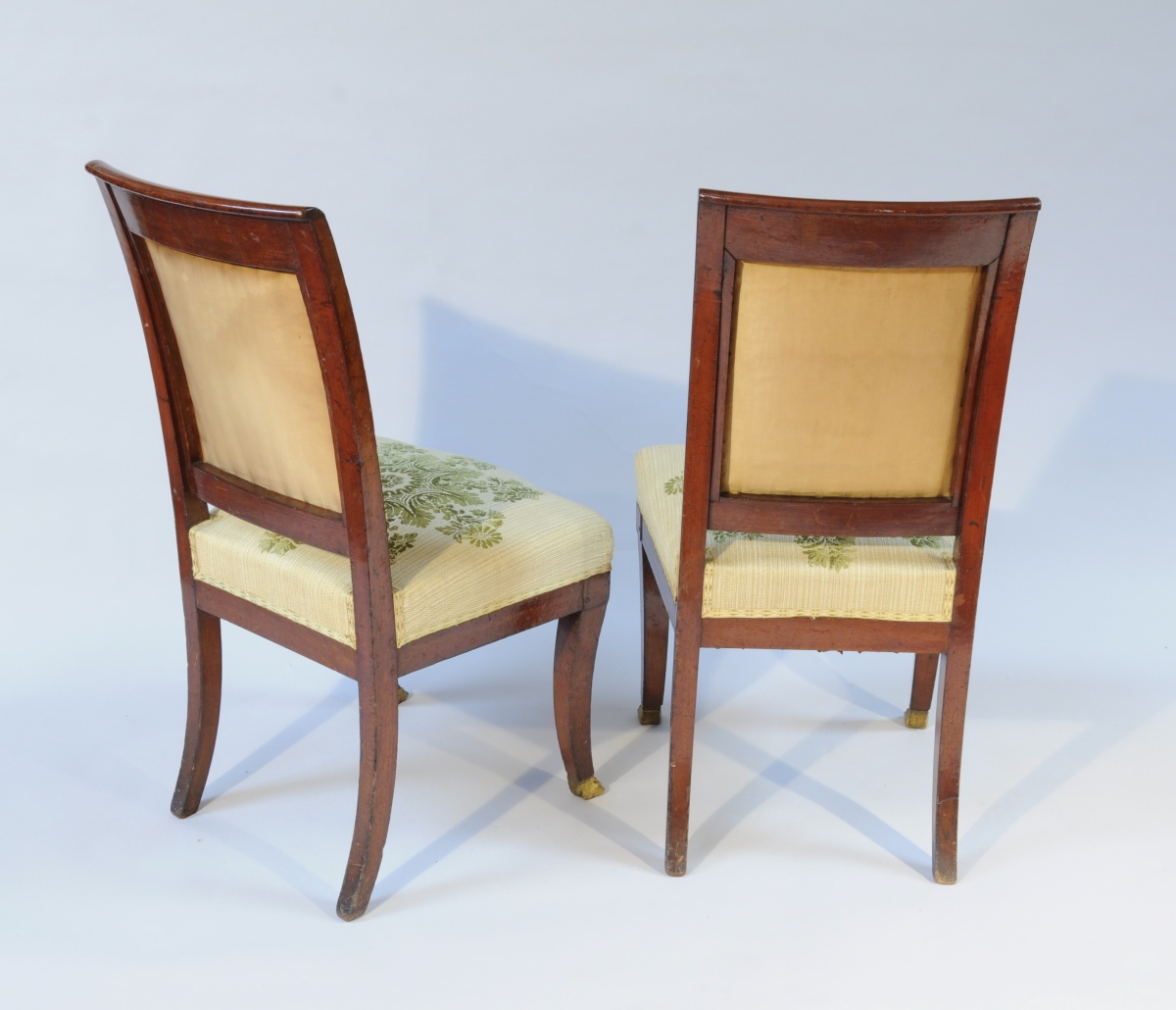 Paire de CHAISES en acajou et placage d'acajou à dossier légèrement renversé reposant sur quatre pieds sabre.