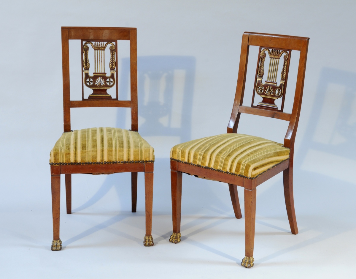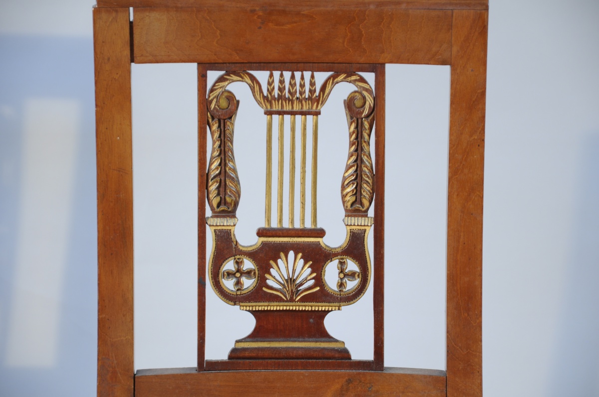 Paire de CHAISES en noyer teinté à la façon de l'acajou, le dossier ajouré d'une lyre rehaussée à l'or. Pieds antérieurs à griffes de lion en bois doré, pieds postérieurs sabre.