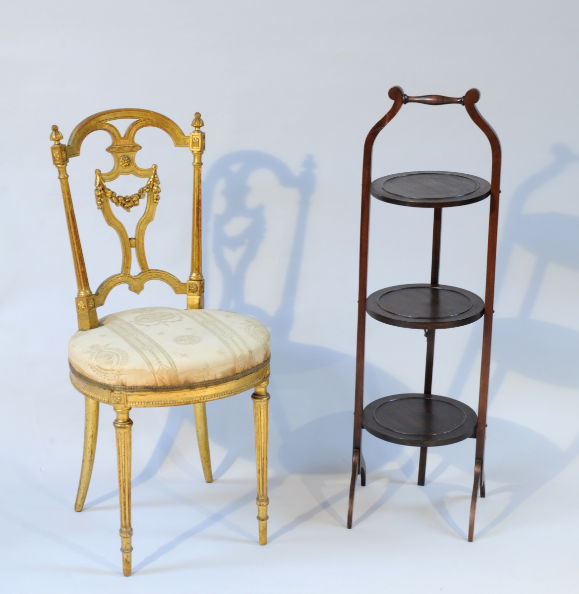 JOINT : Petite CHAISE VOLANTE en bois doré à assise circulaire. Dossier ajouré d'une guirlande de fleurs, montants cannelés, dés de raccordement fleuronnés. La ceinture sculpté d'une frise de rais de coeurs. Pieds antérieurs fuselés et cannelés, pieds postérieurs sabres.