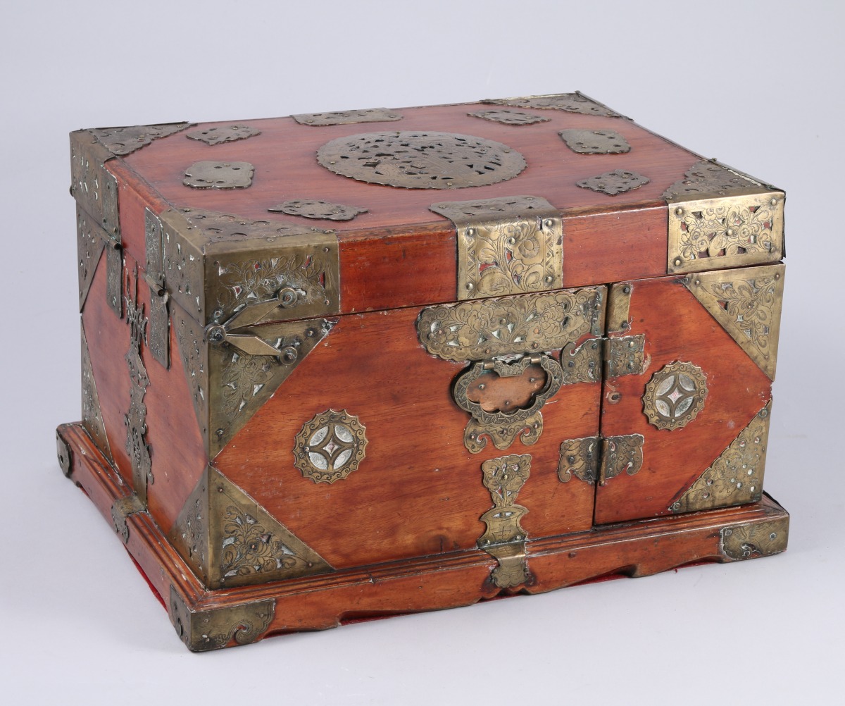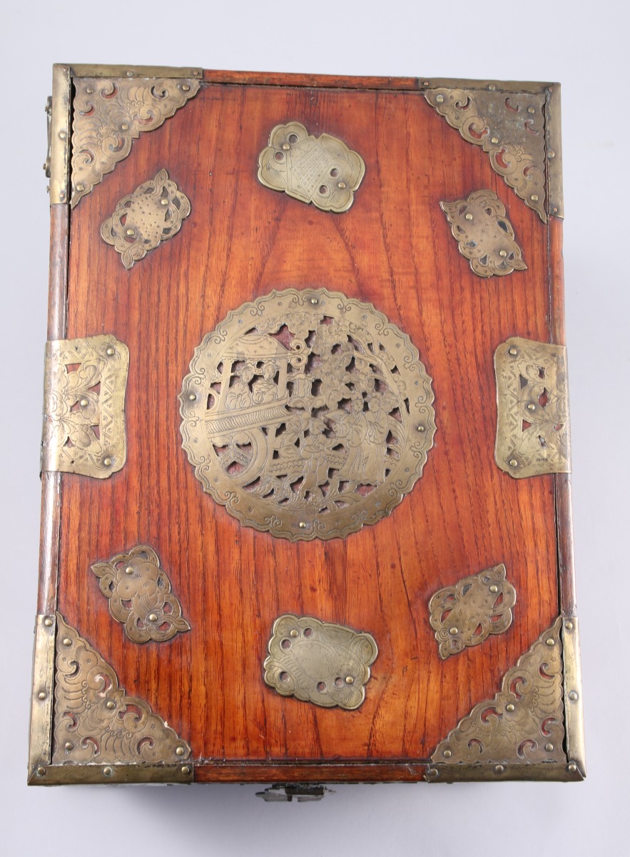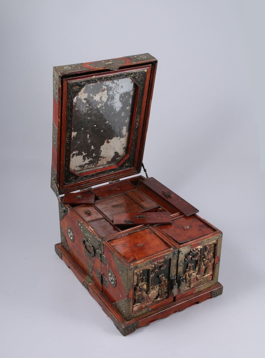 COFFRET DE VOYAGE de forme rectangulaire en bois naturel richement appliqué d'ornements en laiton ajouré. La façade agrémentée de deux panneaux sculptés de bas reliefs dorés figurant des scènes de palais.Il ouvre sur un intérieur à dix compartiments couverts et cinq tiroirs. Un miroir amovible logé à l'intérieur du couvercle.