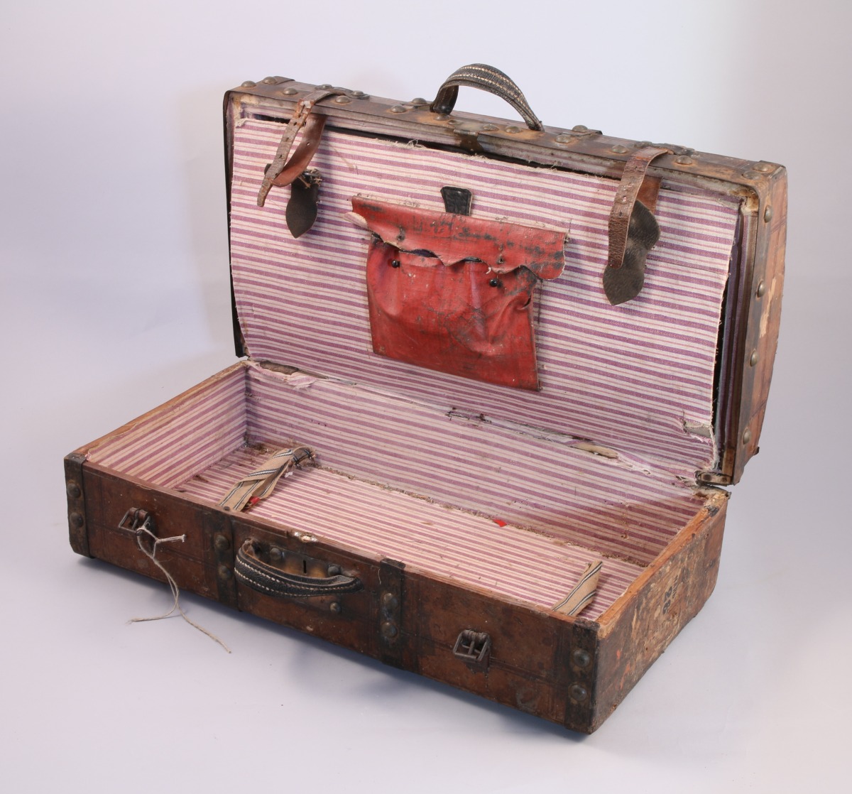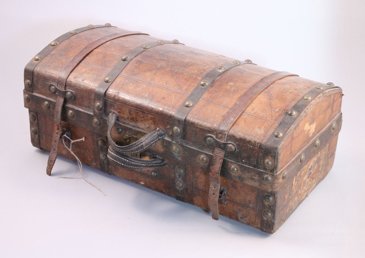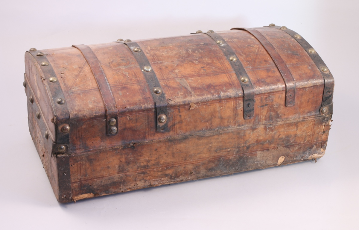 Petite MALLE de forme rectangulaire à couvercle bombé. Àme de bois gainée de cuir estampé de quadrillages et de croix. Pantures de fer à clous de laiton bombés.