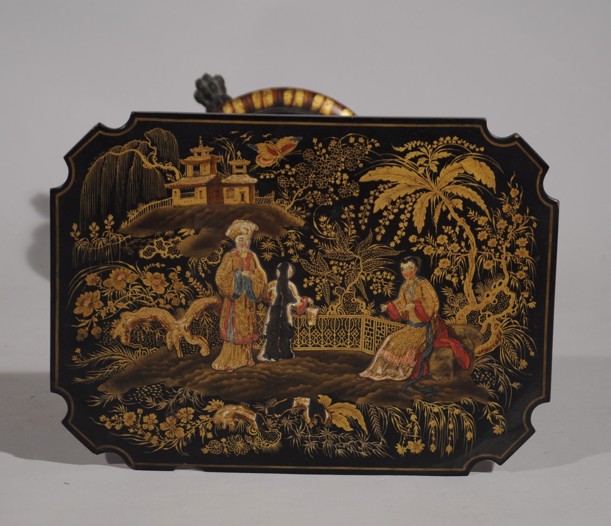 Petite TABLE VOLANTE. Le plateau de forme rectangulaire à coins échancrés en carton bouilli laqué polychrome et or sur fond noir à décor de personnages dans un jardin. Piètement en bois laqué noir et or. Fût bagué à décor de fleurs de lotus et godrons. Base de forme circulaire reposant sur trois pieds griffes en bronze.