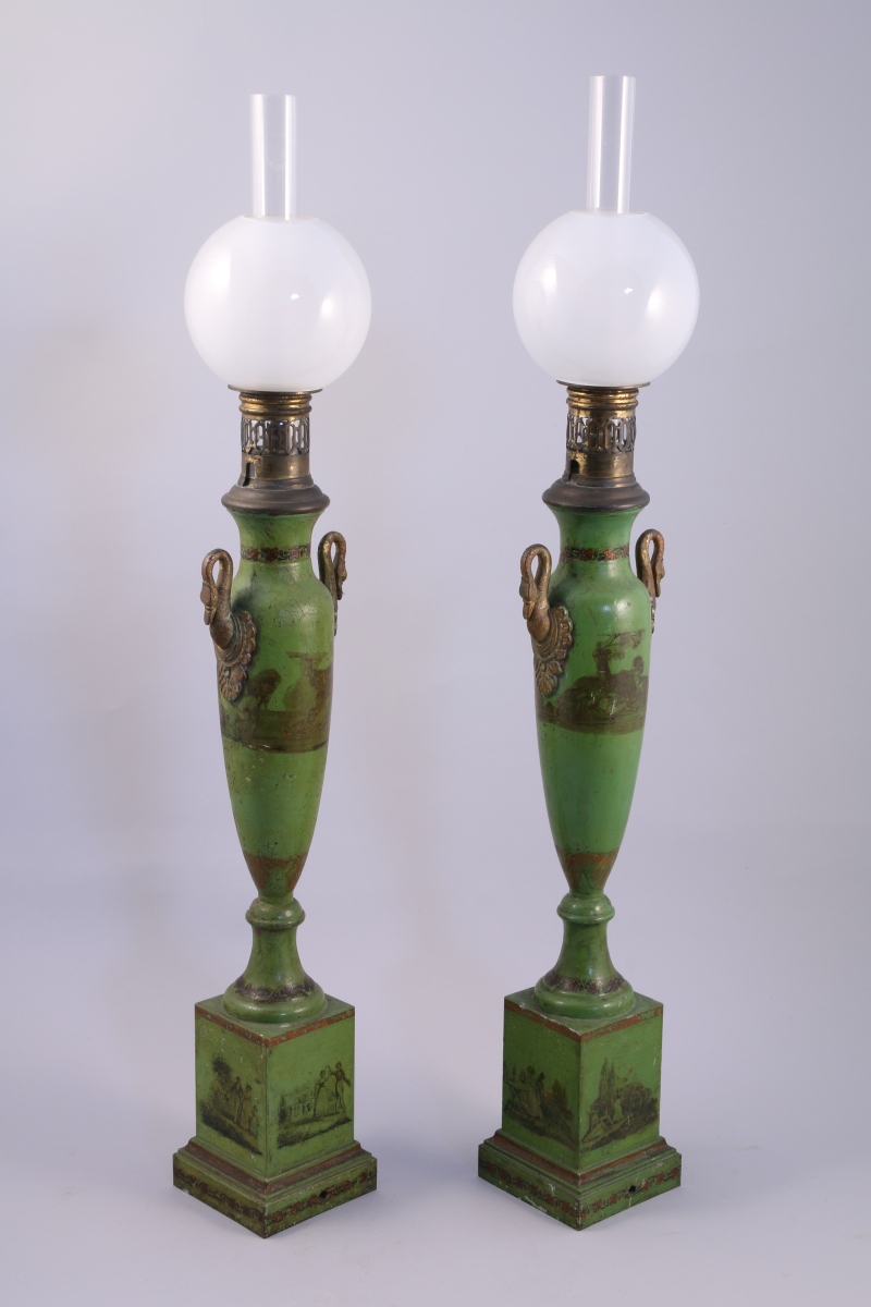 Paire de LAMPES À PÉTROLE de forme balustre en tôle peinte de couleur verte. Décor décalcomaniés figurant putti, scènes bucoliques et frises feuillagées. Anses latérales en bronze adoptant la forme d'un col de cygne à attache feuillagée. Base de forme carrée.