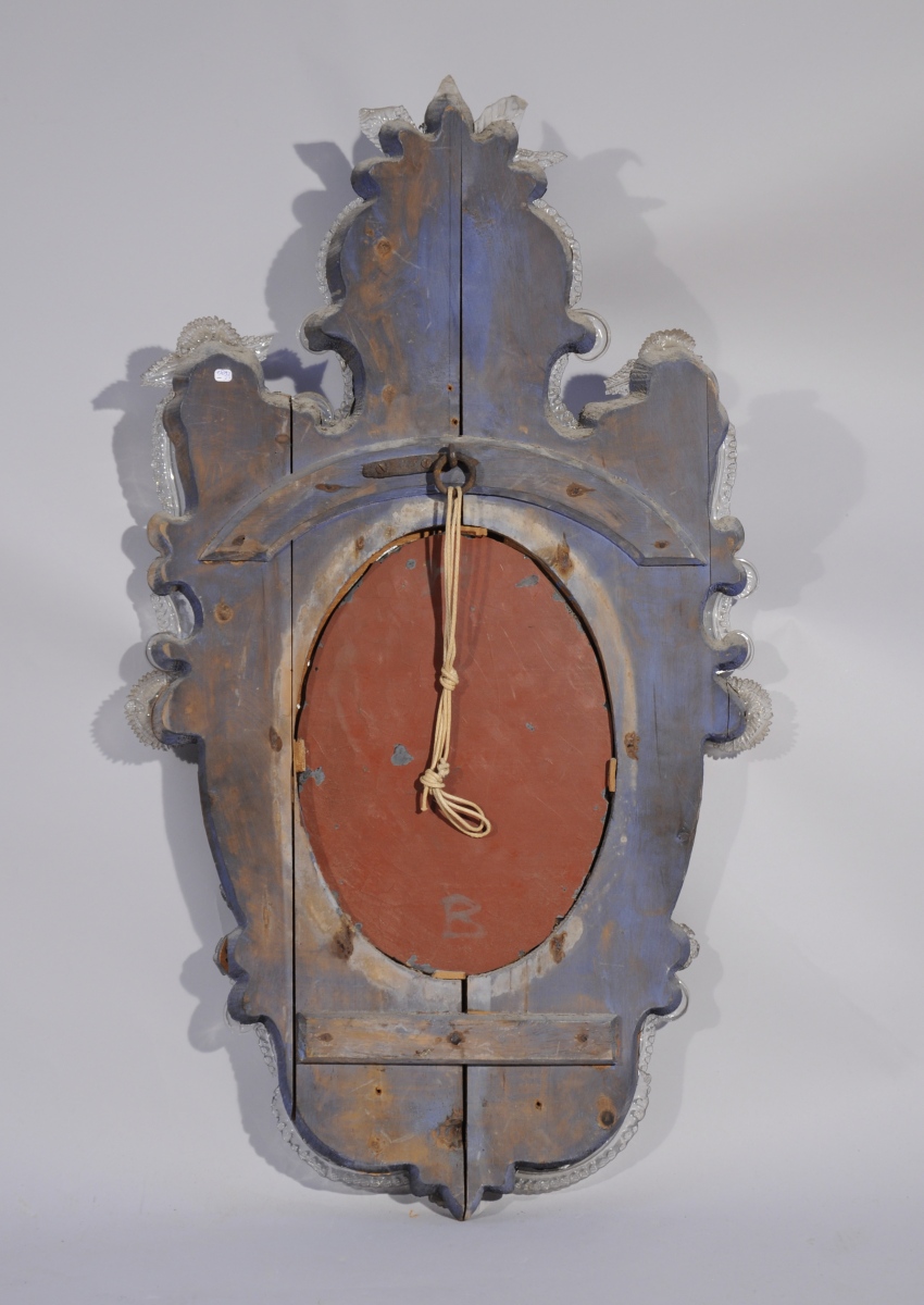 MIROIR À PARECLOSES dit "de Venise" de forme chantournée en verre. La partie centrale de forme ovale agrémentée d'un fronton, d'épaulements et d'un culot à décor d'éléments appliqués figurant fleurs, feuillages et agrafes. Les miroirs gravés de rinceaux fleuris.