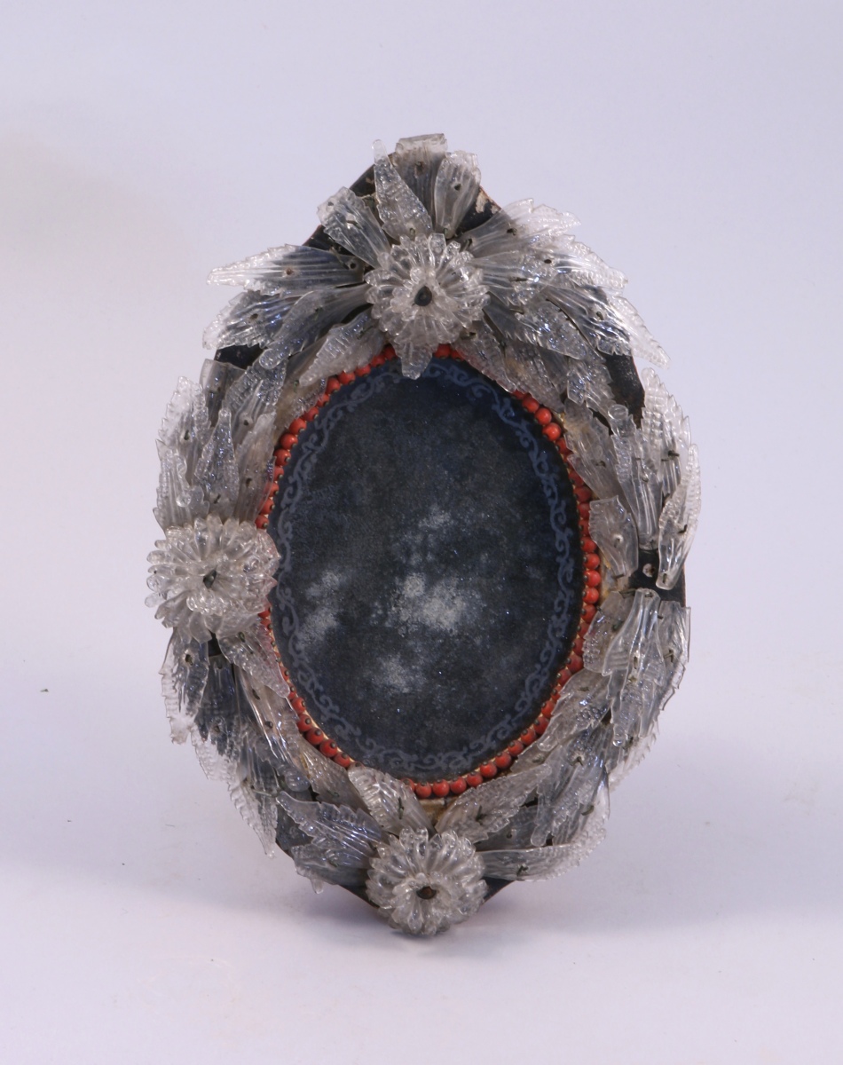 Petit MIROIR dit "de Venise" de forme ovale. La glace centrale gravée de rinceaux s'inscrit dans un cadre en bois doré agrémenté de perles de corail rouge. Encradrement d'éléments appliqués figurant fleurs et feuillages.