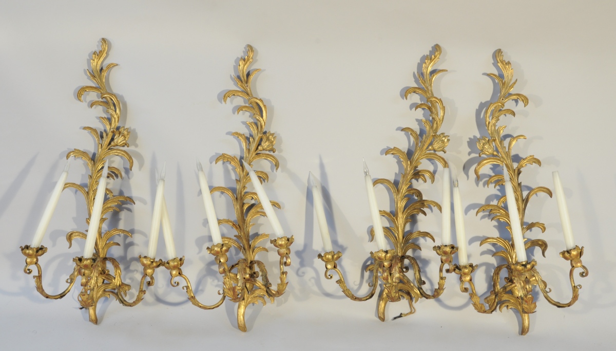 SUITE DE QUATRE APPLIQUES à deux bras lumières en bois sculpté, stuqué et doré. Elles adoptent la forme d'une palme mouvementée. Les bras de lumière en métal à enroulements appliqués d'acanthe en tôle emboutie. Le bobèches figurant une fleur épanouie.
