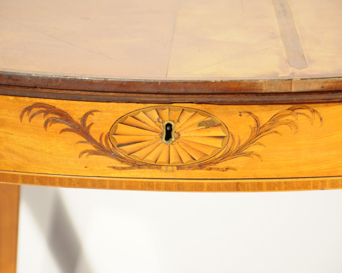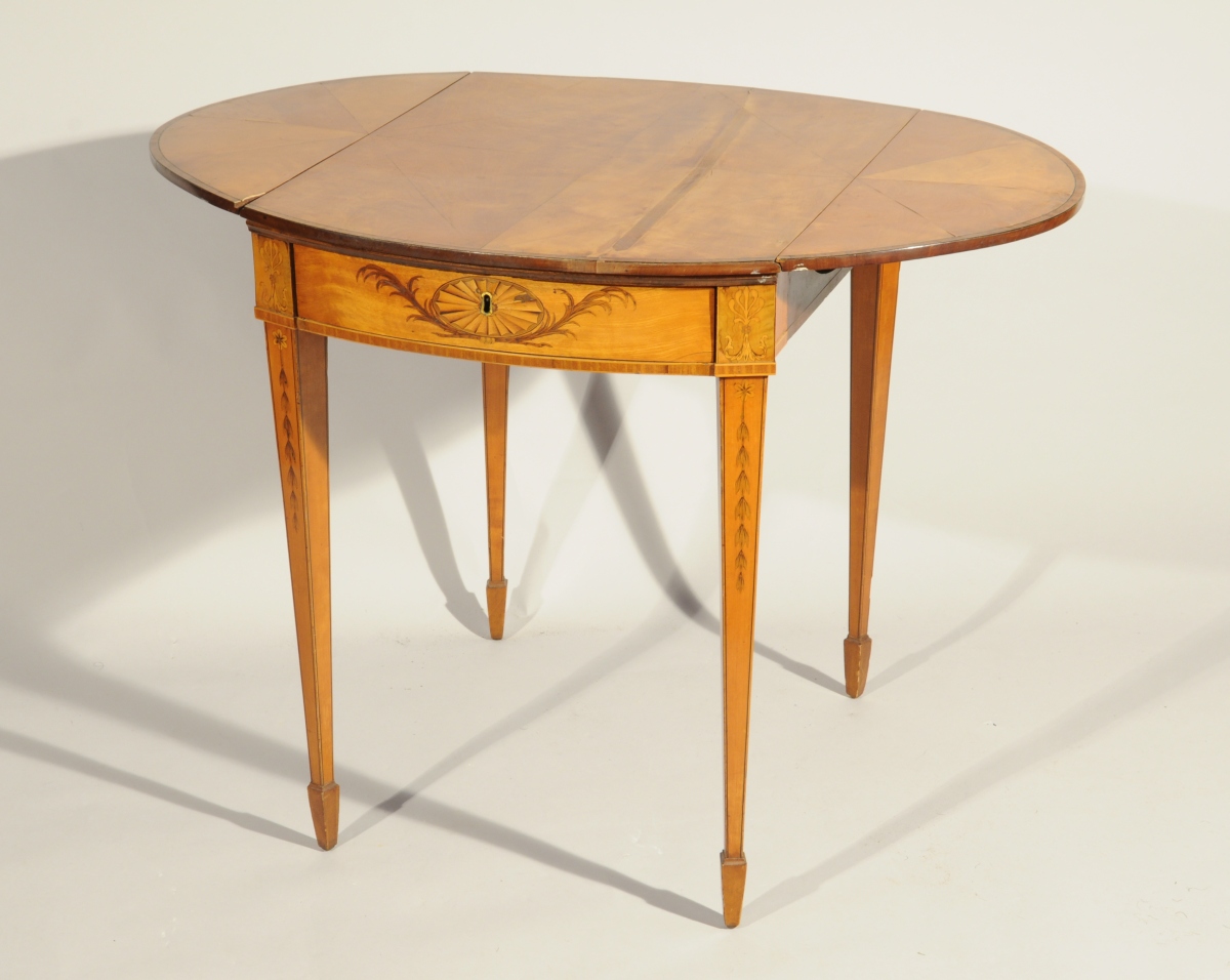 Petite TABLE DE SALON de forme ovale en placage de bois clair à décor marqueté de motifs rayonnants falnqués de palmes, chutes de laurier, palmettes et fleurons. Elle ouvre par un tiroir en ceinture. Pieds gaine fuselés. Les extrémités du plateau rabattables.
