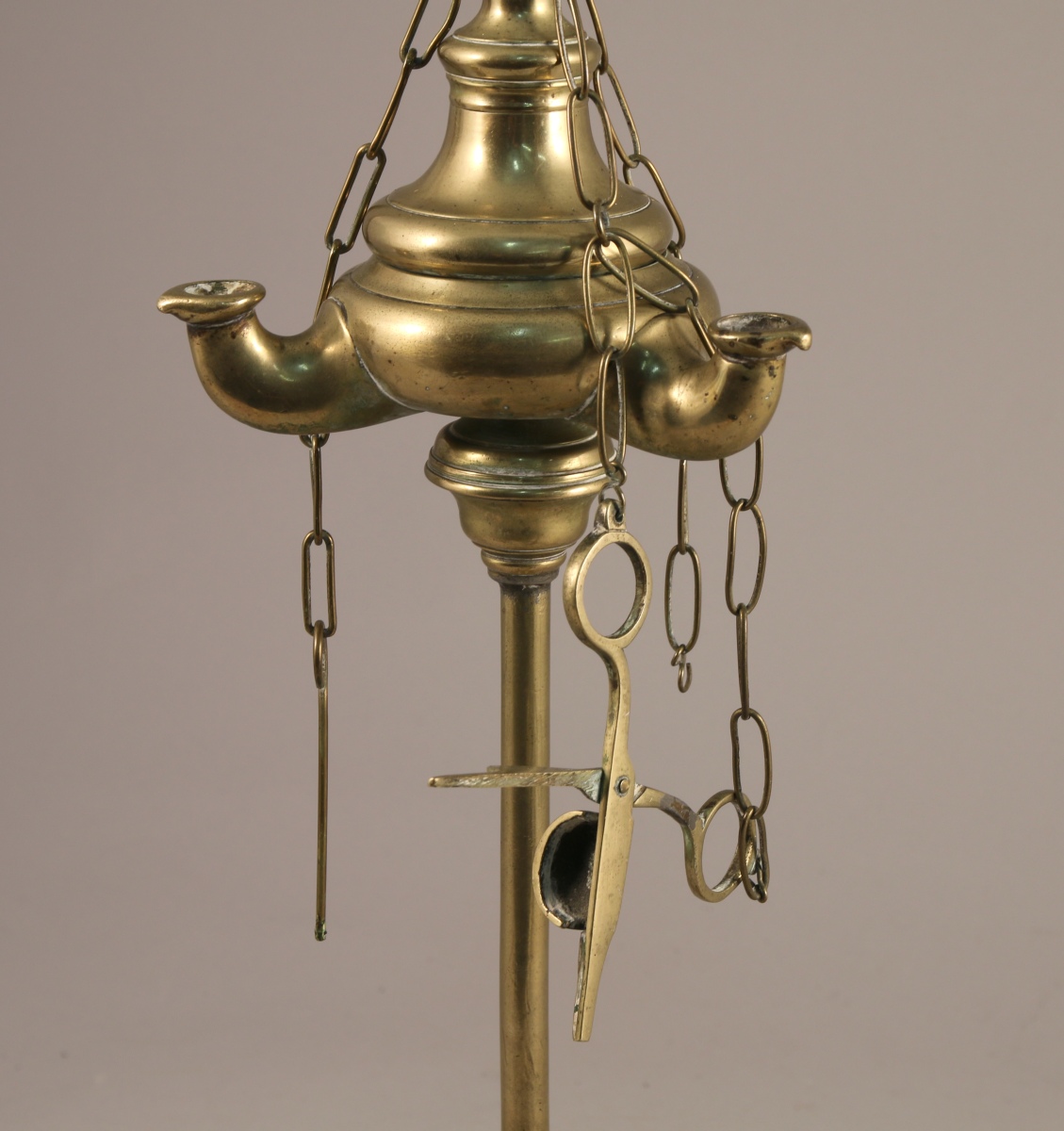 LAMPE À HUILE dite "florentine" à trois becs de lumière en laiton, avec sa mouchette et son poinçon. Prise en agrafe feuillagée. Base découpée à degrés.