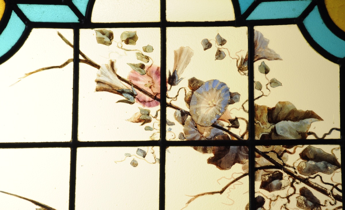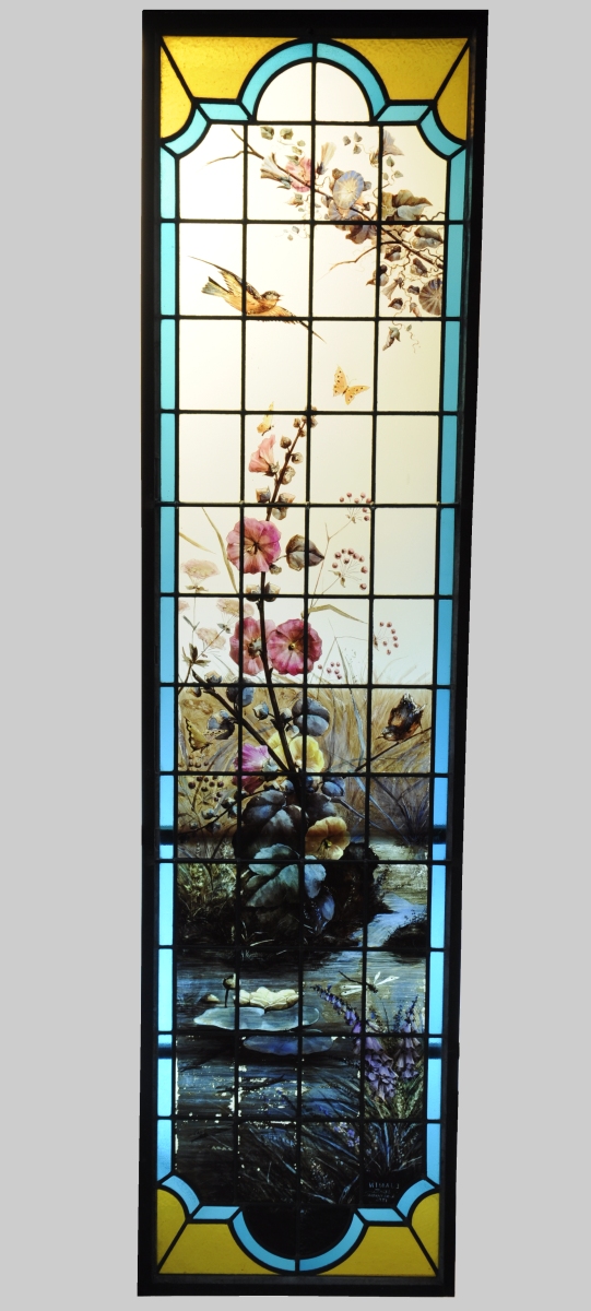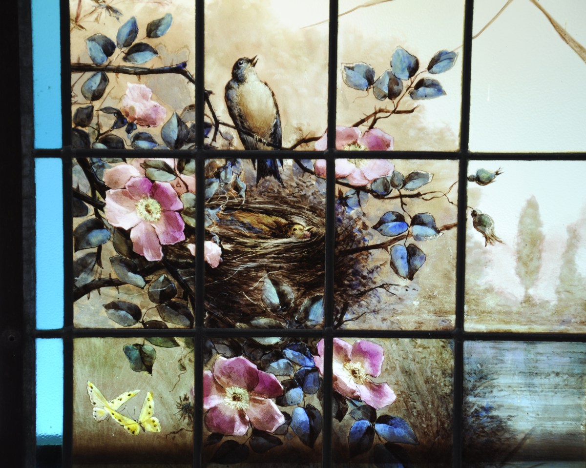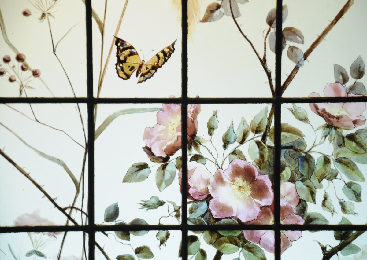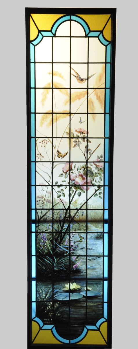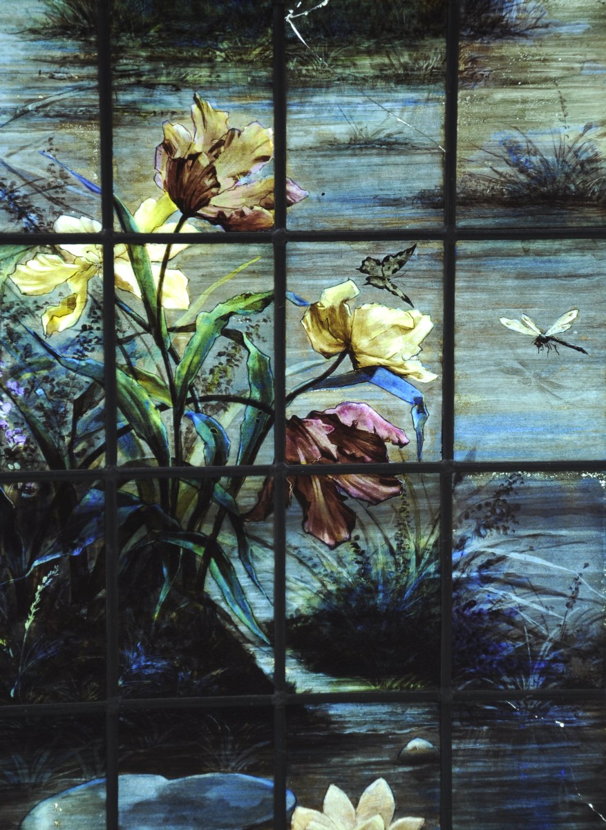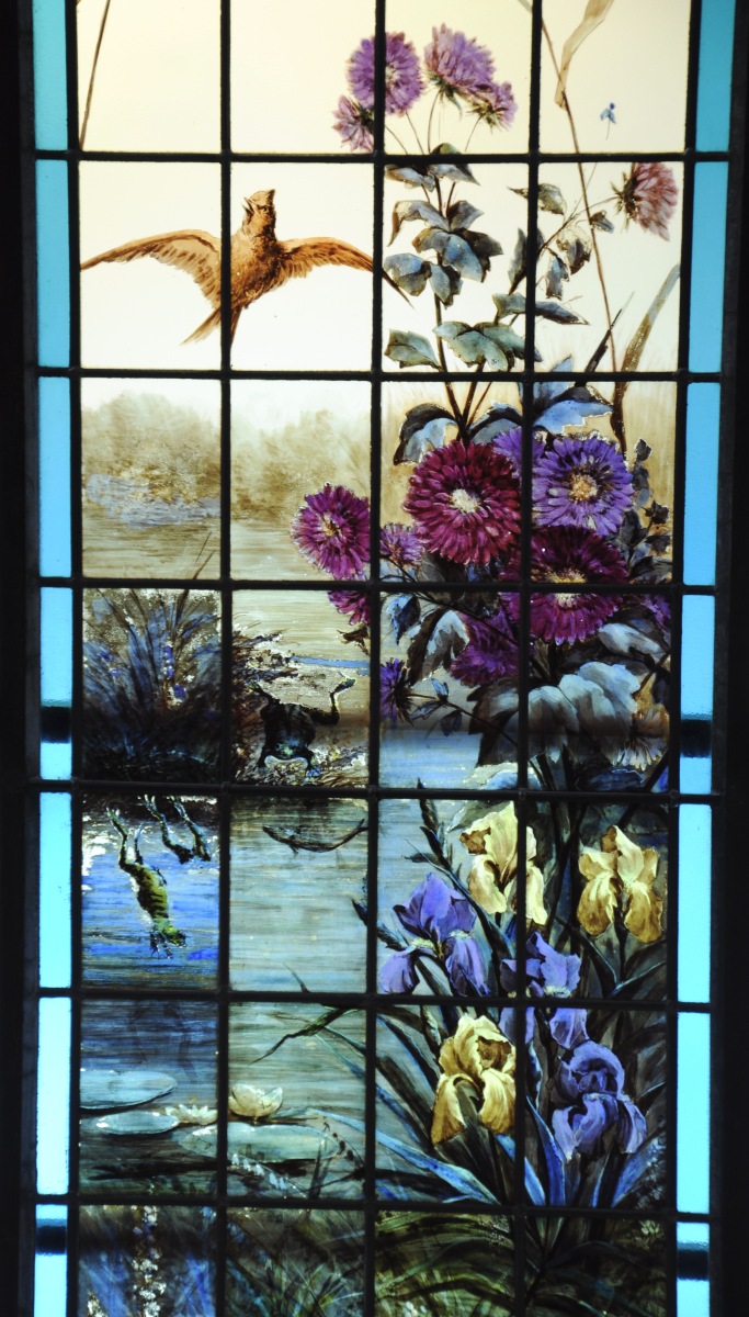 VITRAUX au plomb. QUATRE PANNEAUX de verrieres - grisaille et émaux sur verre incolore. Scènes lacustres animés de petits animaux : oiseaux et nid, papillons, libellules, poisson, grenouilles - parmi des feuillages, et fleurs.