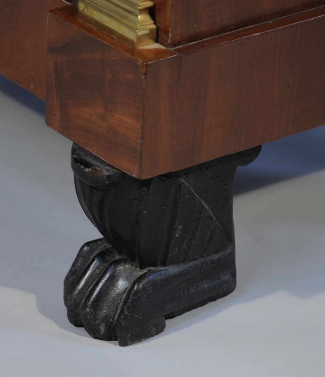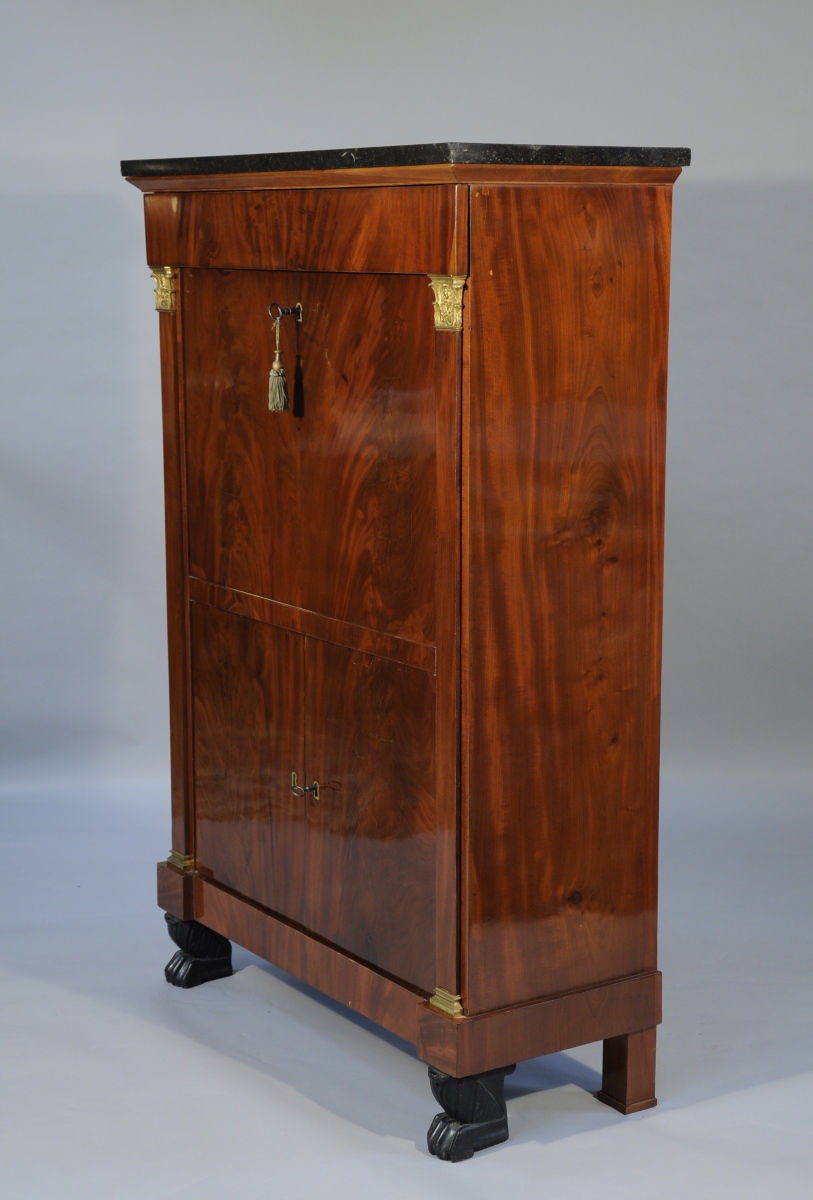 SECRÉTAIRE en acajou et placage d'acajou ouvrant en façade par un abattant et deux vantaux. Pieds antérieurs en patte de lion. Chapiteaux et bases des pilastres en bronzes dorés. Dessus de marbre noir.