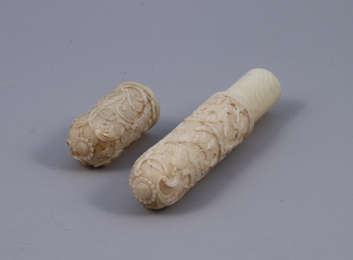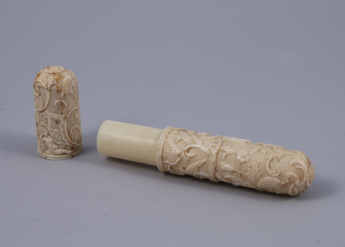 ÉTUI À BILLETS DOUX en ivoire, de forme cylindrique, finement sculpté en bas relief sur le capuchon d'une nymphe à la source et d'oiseaux picorant du raisin, sur le corps de vendangeurs, cage à oiseaux, arabesque, tulipes, oiseaux branchés et fruits exotiques et de tournesols à chaque extrémité.