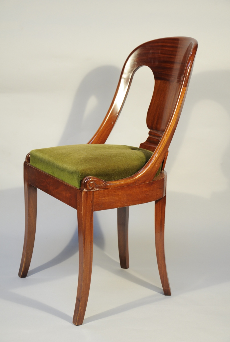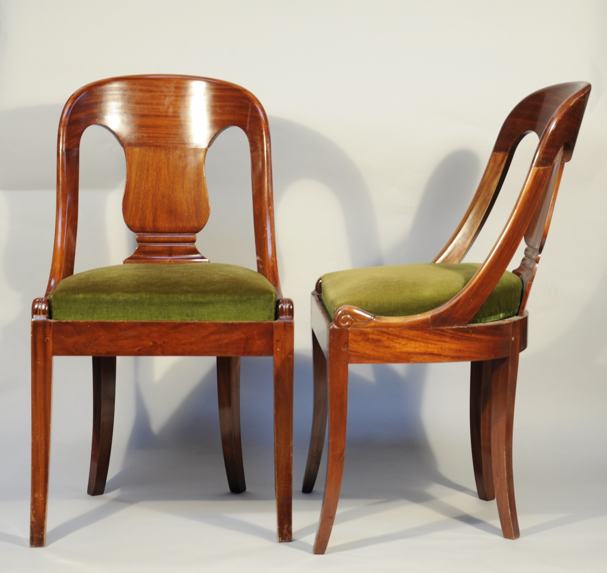 Paire de CHAISES GONDOLES en noyer teinté acajou. Reposent sur quatre pieds sabres.