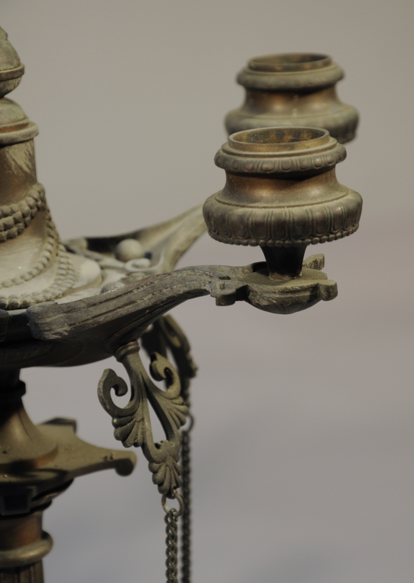 PAIRE DE CANDÉLABRES en bronze patiné à cinq bras de lumière. Fût cannelé à chainettes reposant sur un buste de femme en hermès. Base tripode à griffes de lions, têtes de griffons et palmettes. Une grue sur un socle à la partie supérieure.