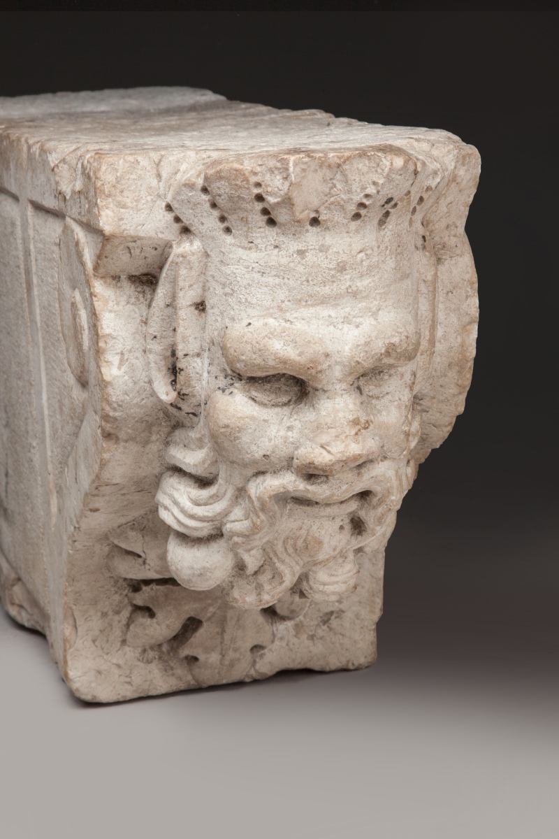 DEUX ÉLÉMENTS d'architecture en calcaire, consoles supportant le linteau d'une porte ou d'une fenêtre (?). une tête d'homme barbu à la moustache fleuri sort de manière saillante, alors que les deux côtés sont sculptés d'un rectangle et d'un motif en spirale.