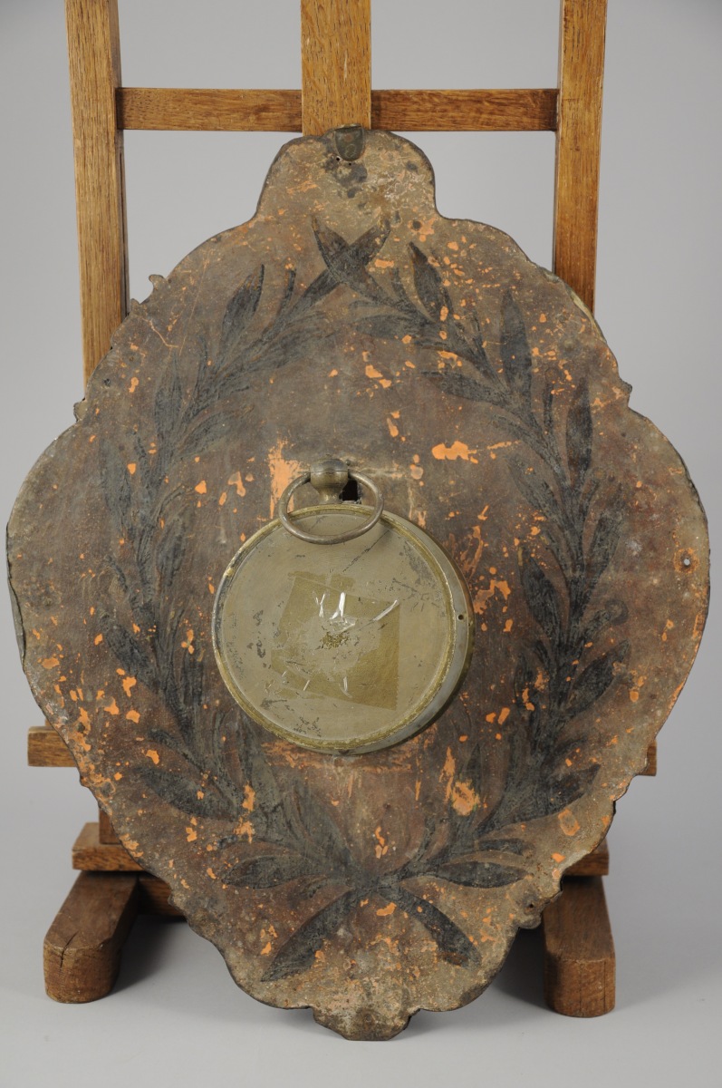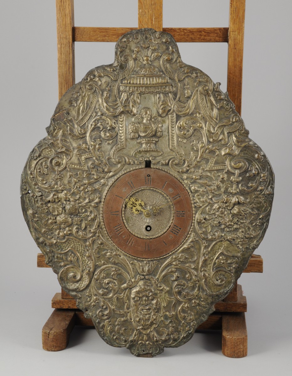 PENDULE de forme chantournée en métal repoussé. Elle figure sous un dais le buste d'un empereur romain en armure et reçoit un riche décor de volutes feuillagées, ferronneries, bouquets de fleurs et fruits et masque de faune. Le cadran de forme ronde en cuivre indique les heures en chiffres romains et les minutes en chiffres arabes. Il est signé "Ios Antoni Schoner Augustae".