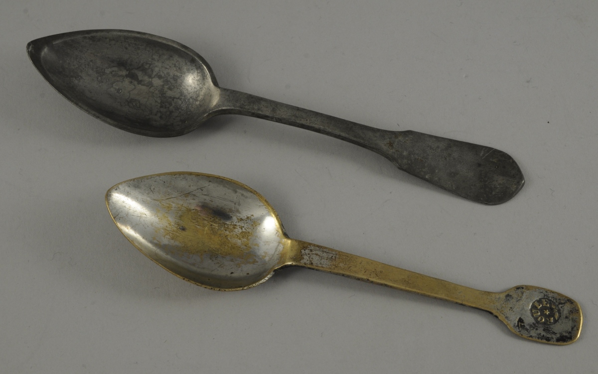 - La première en laiton étamé. Elle possède un large cuilleron. Le manche terminé par une spatule marquée "ROULE" dans un cercle centré d'une étoile. Travail ancien, Normandie ? Long. 18,3 cm. (manque à l'étain)