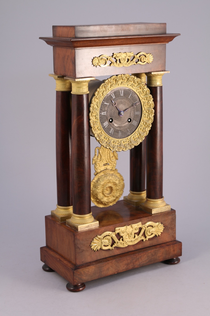 PENDULE PORTIQUE À COLONNES en placage d'acajou. L'entablement à doucine retenu par quatre colonnes d'ordre dorique enserrant le mouvement. Base en plinthe reposant sur quatre pieds en boule aplatie. Garniture de bronzes ciselés et dorés tels que applications sur la base et l'entablement à décor ajouré de dauphins et palmettes, chapiteaux et bases des colonnes à frises de feuilles d'eau et tores de lauriers. Cadran en métal argenté indiquant les heures en chiffres romains serti d'une frise de feuillages stylisés. Balancier à riche décor de fleurs et feuillages sommés de deux cygnes adossés.