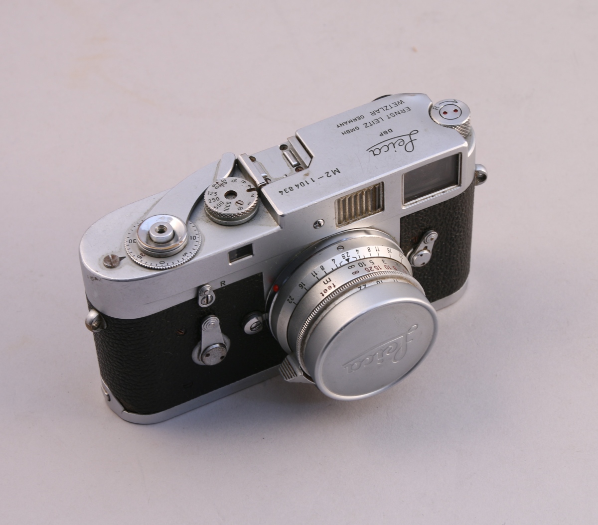 Leica M2 No 1104834 avec objectif Summaron 1:2.8 / 3,5, avec sacoche brune.