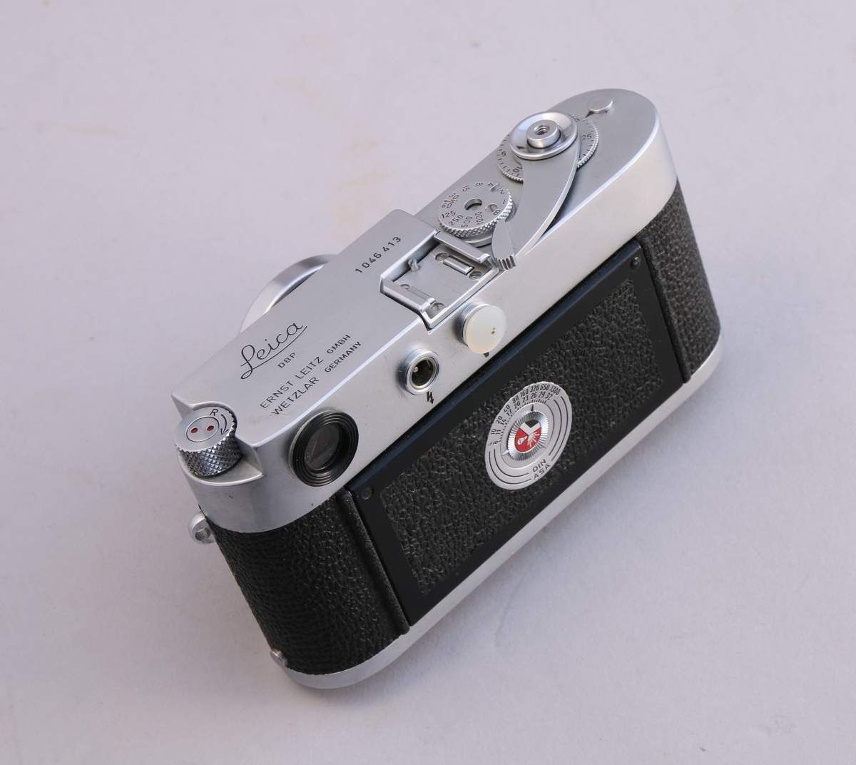 Leica M1 No 1046413 avec objectif Summicron F = 5 cm 1:2 No 1144197, avec sacoche usagée.