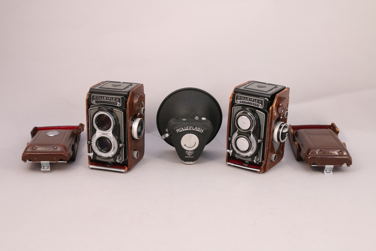 Rolleiflex DBP No 2106642 avec objectif Tessar 3,5 / 75 mm Carl Zeiss No 1579822 et 1:2.8 /25 No 1579822 2476707, avec sacoche. Rolleiflex DBP T2140170 avec objectif Tessar 3,5 / 75 mm Carl Zeiss No et Heidosmat 1:2.5 / 75 No 3015261, avec sacoche. Un Flash RolleiFlash.