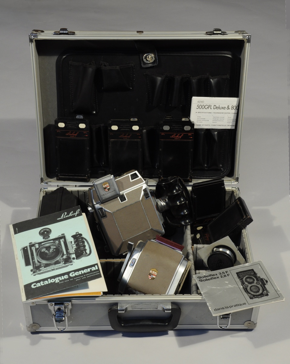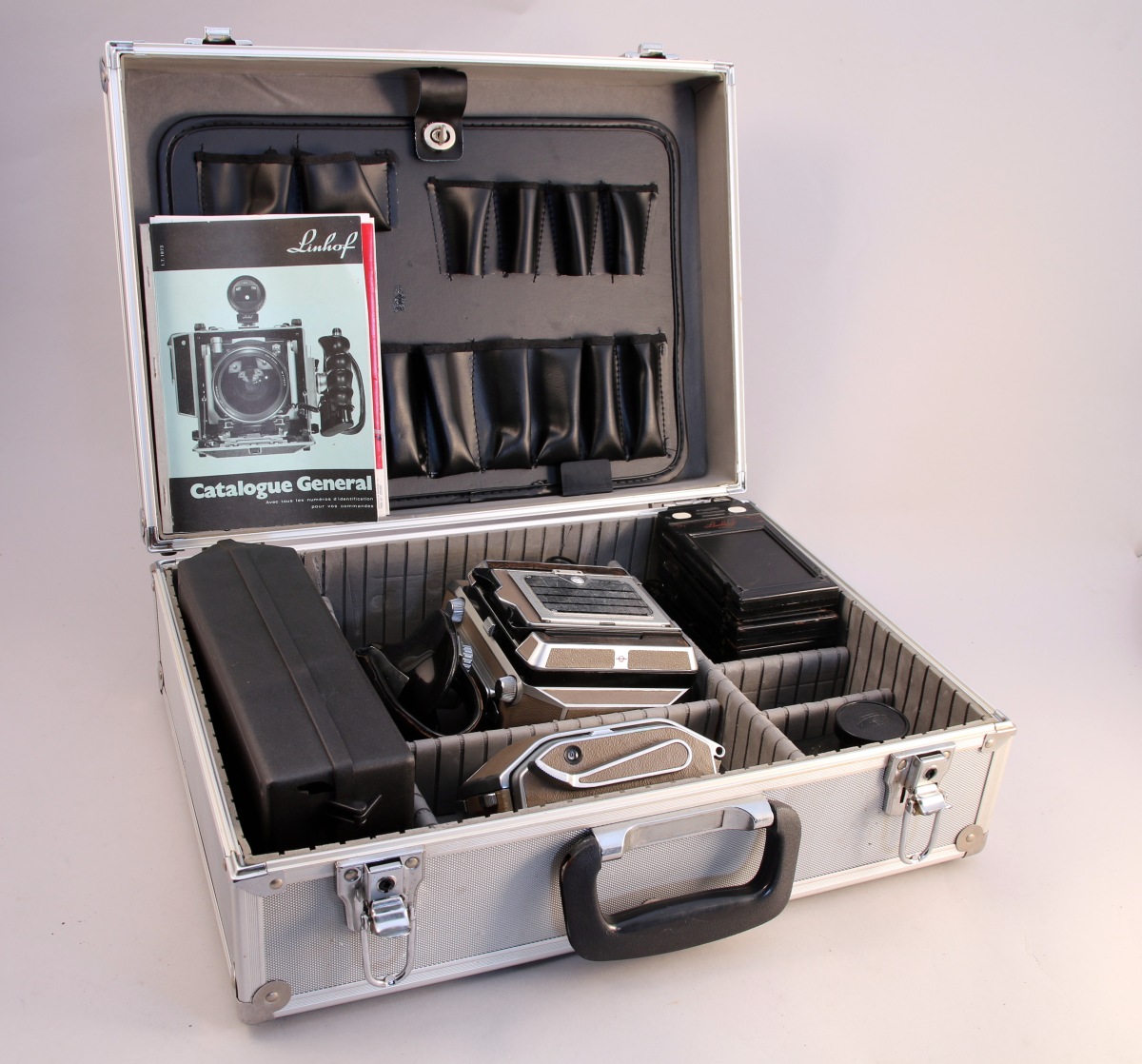 d’un valise métal couleur argent, d’une poignée, d’un dos, de magasins et catalogue Général Linhof des années 1970.