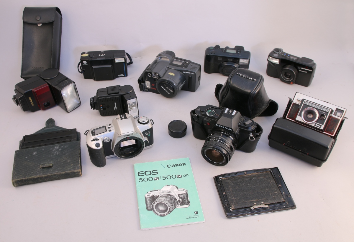 7 APPAREILS dont Olympus AZ300 et Olympus Superzoom70, Pentax P30, Kodak Instamatic, Canon sans objectif avec notice EOS 500, Pentax Espio115, Minolta Autofocus. Flashes Canon 299T et Hannimex 325AZ. Un portefeuille avec 3 supports de négatifs Voigtländer.