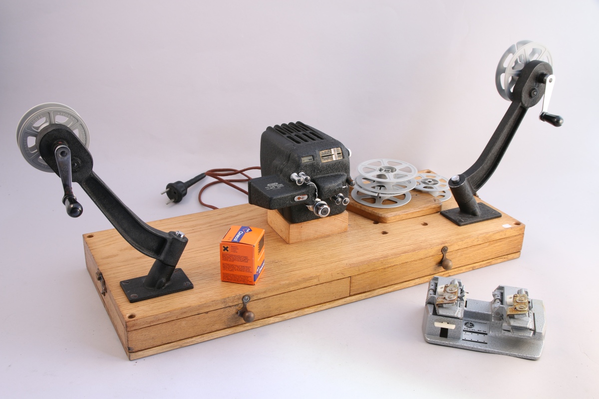 Appareil à monter les films ALMO 2055 No 407445 dans sa malette en chêne, avec poignée et tiroirs à accessoires pour films et ampoules.