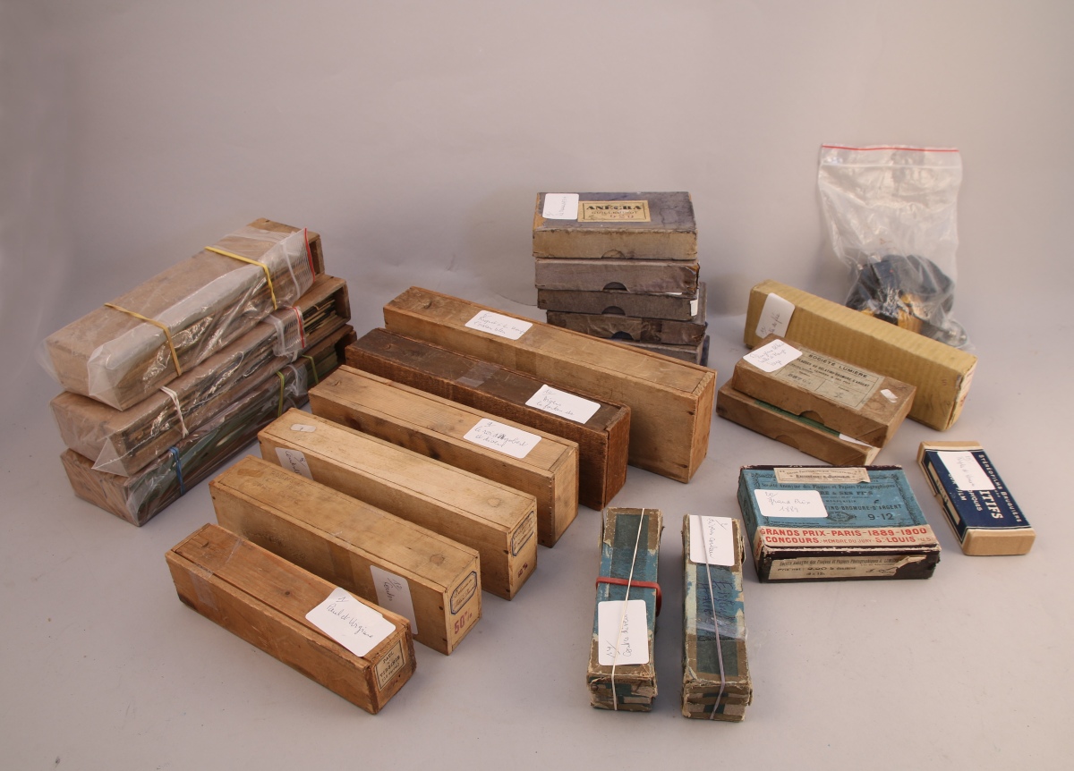 Négatifs verre : 9 x 12 cm. Divers sujets Plaques en couleurs pour lanterne magique dans leur étui en bois. De 3,8 x 15 cm à 6,5 x 27 cm : Cendrillon, Paul et Virginie, le roi Dagobert, Riquet à la houppe,