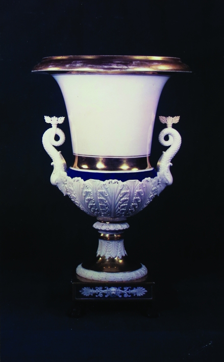 Jolies couleurs de verreries et très beau vase à l'antique en porcelaine blanche et dorée. Charmante composition aux éléphants.