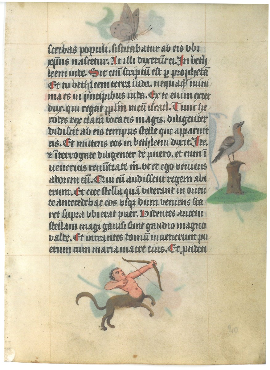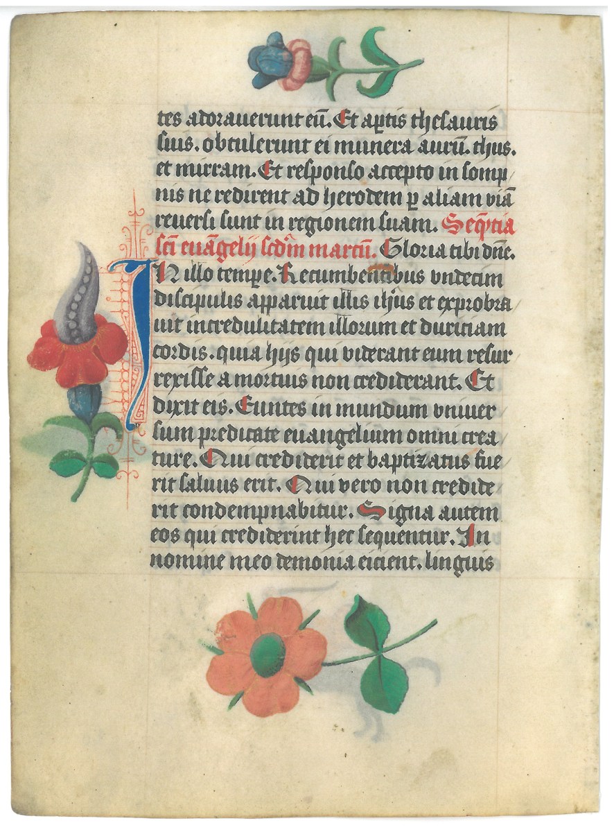 Fragment d'un livre d'heures, extrait des évangiles centaure et fleurs en marges, flamand début 16éme.