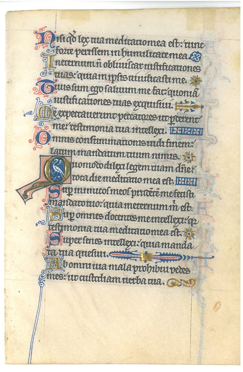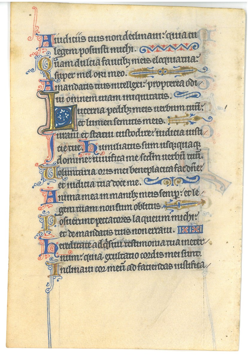 Fragment manuscrit fin 13éme début 14éme nord avec bouts de lignes et hastes à l'or et aux gouaches.