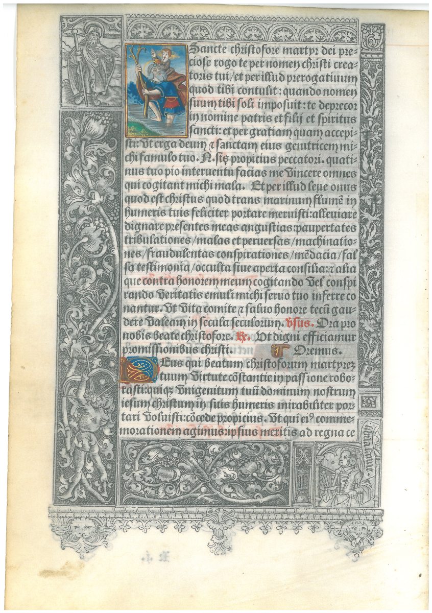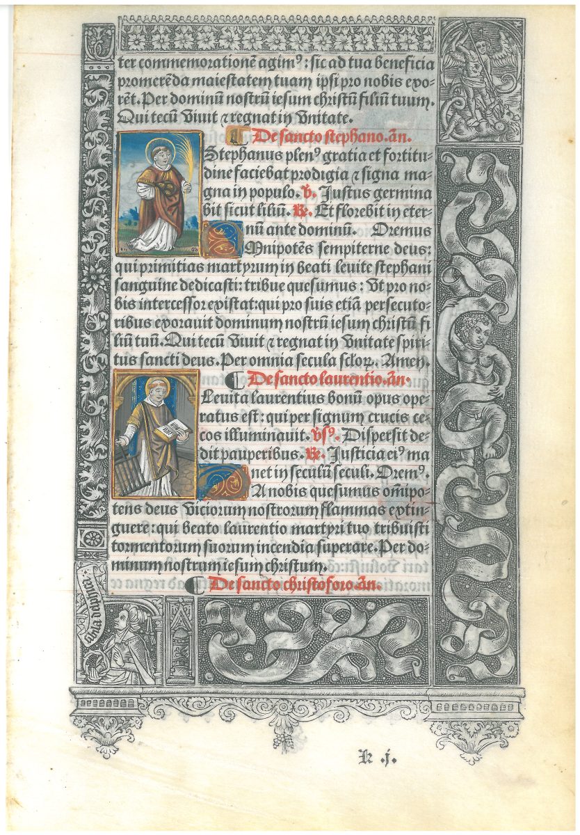 Feuillet extrait d'un livre d'heure imprimé sur vélin, rehaussé de vignettes 16éme.