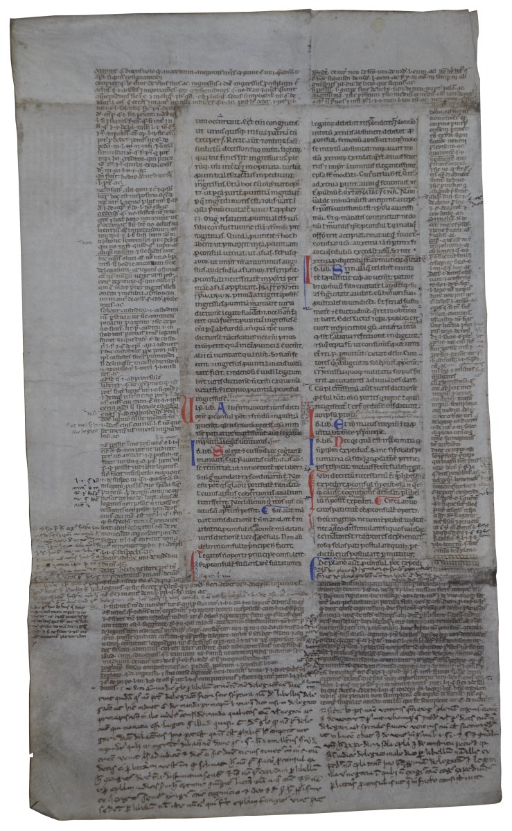 Feuillet de manuscrit de droit canon du premier tiers du 13 éme siècle (circa 1230) du sud de la France , Avignon ou plus probablement Toulouse. La feuille se trouve enchâssée dans un vélin , qui a été glosé dans une écriture Parisienne et plus tardive, vers 1280.