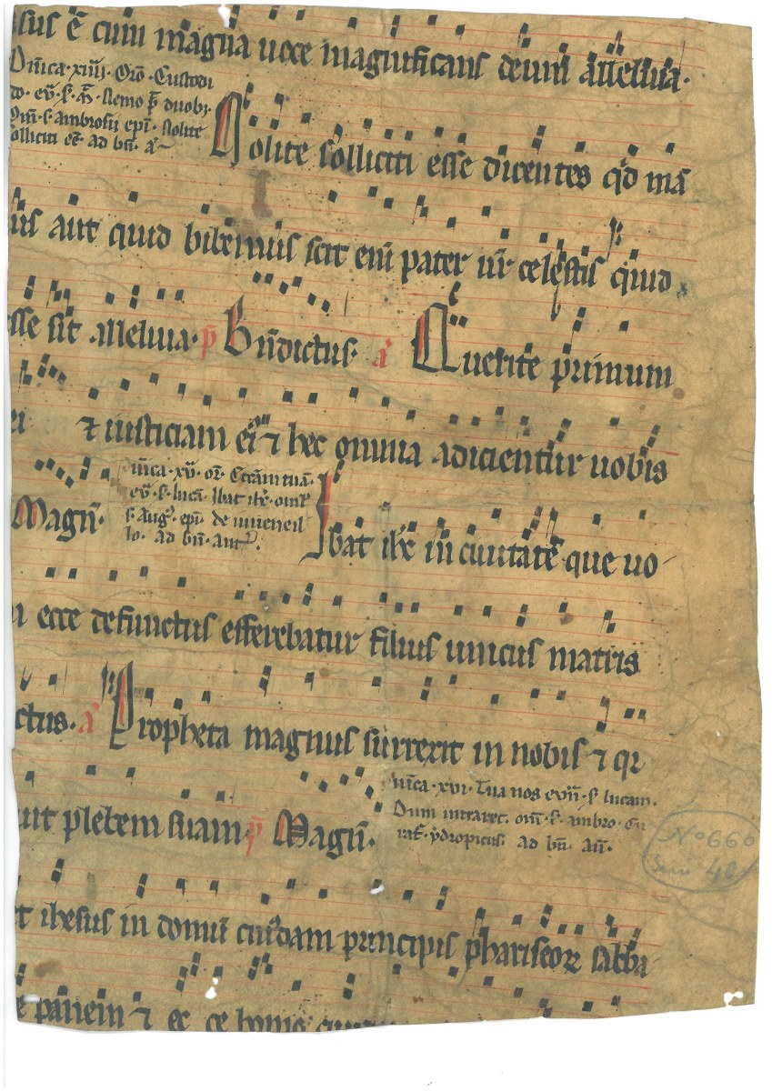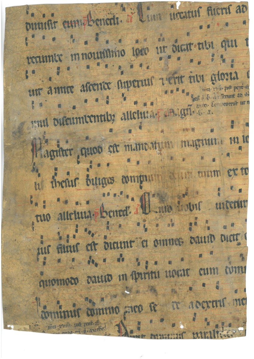 Quelques fragments, dont un début XIVe (54 x 35,5 cm).