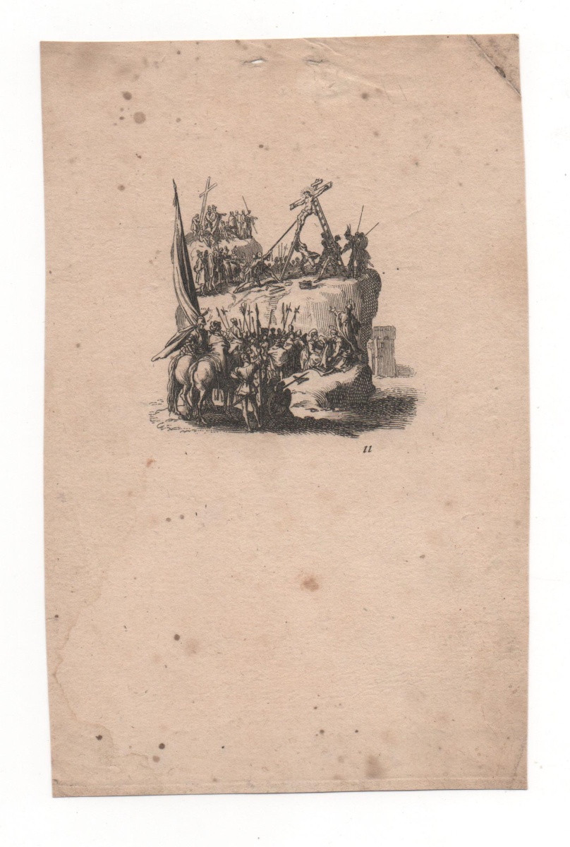 Suite de 11 estampes gravées en taille-douce sur papier vergé, les deux premières portant en bas à gauche Callot in. Numérotées [manque la planche n°12, Jésus percé d'une lance]. Env. 15,5 x 10,5 cm. Piqûres, mouillures, pliures.