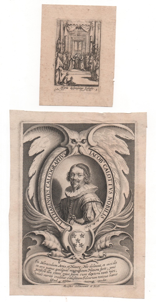 Joint : 2 gravures en taille-douce : Maria Desponsatur Iosepho, signée Callot fecit/Israel excud., 9,5 x 7 cm - Portrait de Jacques Callot, en buste, de 3/4 dirigé à gauche, dans un cartouche ovale, par Michel Lasne, MLasne delineavit et fecit, 17,5 x 13 cm.