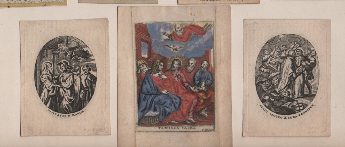 16 images pieuses, gravure sur cuivre, formats divers : 1 p. signée Gasp. Huberti sur vélin ; 12 p. signées F. Huberti dont 5 images sur papier vergé rehaussées à la gouache et aquarelle avec texte en flamand, 3 images sur parchemin rehaussées à la gouache, aquarelle et dorure ; 1 p. signée M. Cabbaey [1660-1722] sur papier vergé rehaussée à la gouache et aquarelle avec texte en flamand ; 2 p. non signées. Contrecollées sur papier épais.