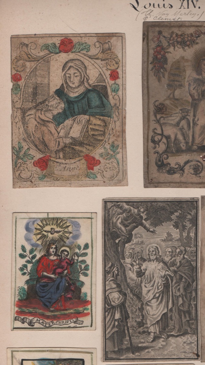 26 images pieuses, gravure sur cuivre, sur papier vergé, vélin et parchemin, formats divers : 6 p. signées Th. Van Merlen dont 4 rehaussées à la gouache, aquarelle et dorure ; 11 p. signées Cor. Van Merlen dont 6 rehaussées à la gouache, aquarelle et dorure ; 2 p. signées P. Clowet rehaussées à la gouache, aquarelle et dorure ; 1 p. signée An. Mar. Bunel [1700-1750] rehaussée à la gouache et aquarelle ; 1 p. signée Spirinx Sc. ; 5 p. non signées. Contrecollées sur papier épais.