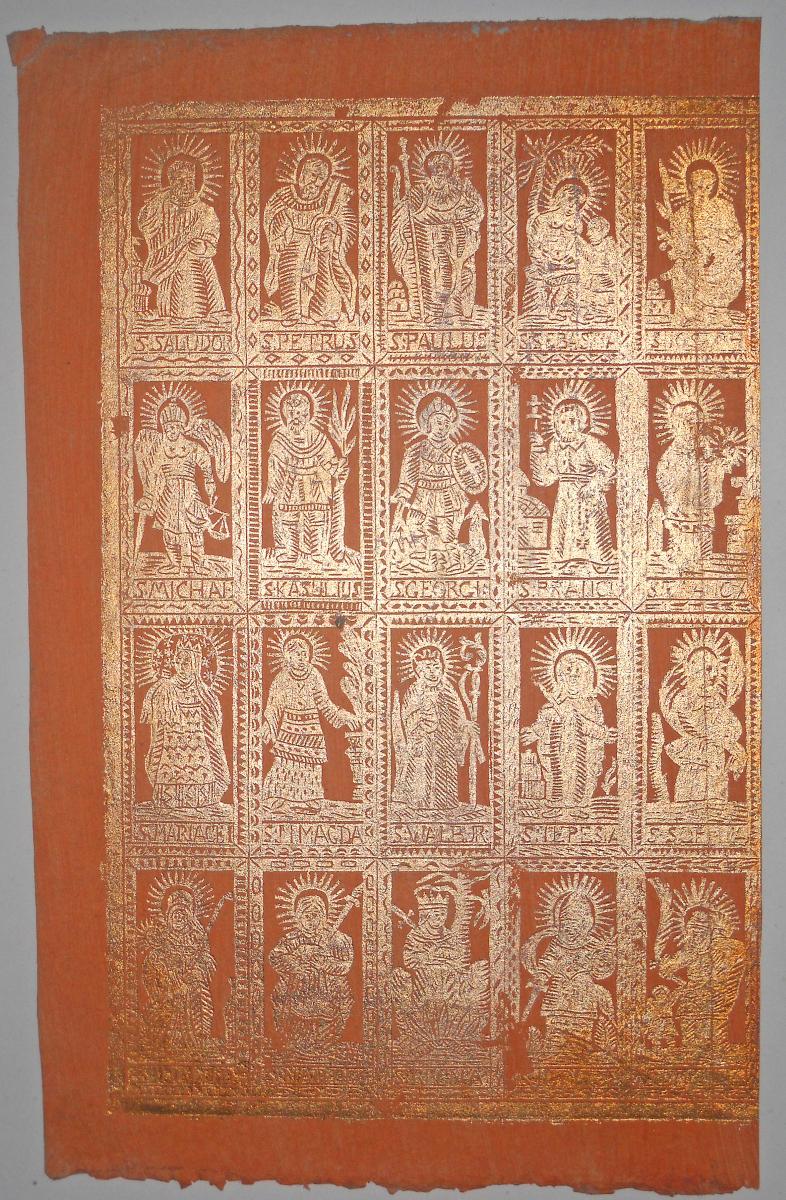 5 planches à compartiments, gravure sur cuivre sur papier gaufré à décor doré ou argenté (Brokatpapiere) : 1 planche de prophètes et 1 planche de saintetés à encre dorée (4x4) et (5x4), 20,5 x 35 cm ; 3 planches de saints à encore argentée dont 1 p. (6x4) signée en bas In Augsp Bey Ioannes Carl Munck n°135 (en l'état), et 1 p. (8x4), 43 x 35 cm ; 1 p. (4x4) 34,5 x 43 cm.