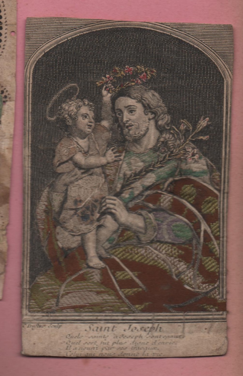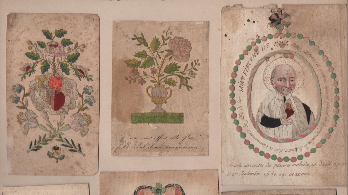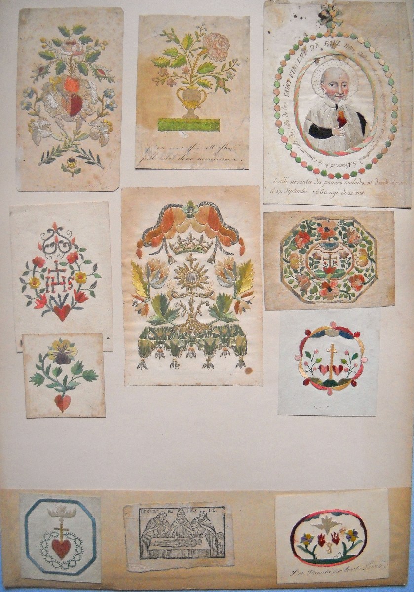 Réunion de 30 images pieuses gravées sur papier vergé ou sur parchemin, certaines rehaussées à l'aquarelle et feuille d'or, d'autres peintes à l'aiguille à décor brodé de soie polychrome, fil d'or et strass, formats divers : Saint Vincent de Paul, l'Adoration eucharistique, le Sacré-Cœur, S. AGNES, S. JULIANUS MARTYR, etc.