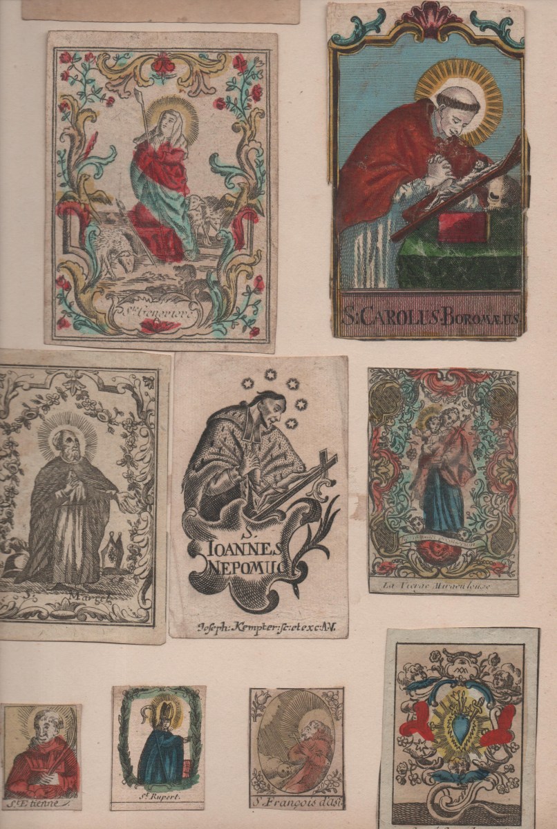 Env. 145 images pieuses, gravure sur cuivre, sur papier vergé et parchemin, la plupart rehaussées à l'aquarelle, formats divers, dont une suite de 10 images légendées de prophéties ; petit canivet en parchemin à rehaut polychrome signé An. Mar. Bunel ; 9 images de saints éditées chez " Basset " rue St Jacques à Paris ; 2 miniatures peintes sur parchemin Adoration des mages et Jésus au jardin des olives ; S. Ludovicus peint sur papier vergé à la gouache polychrome, argentée et dorée, école allemande, 16 x 20,5 cm ; etc. Contrecollées sur papier épais.