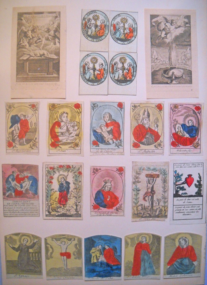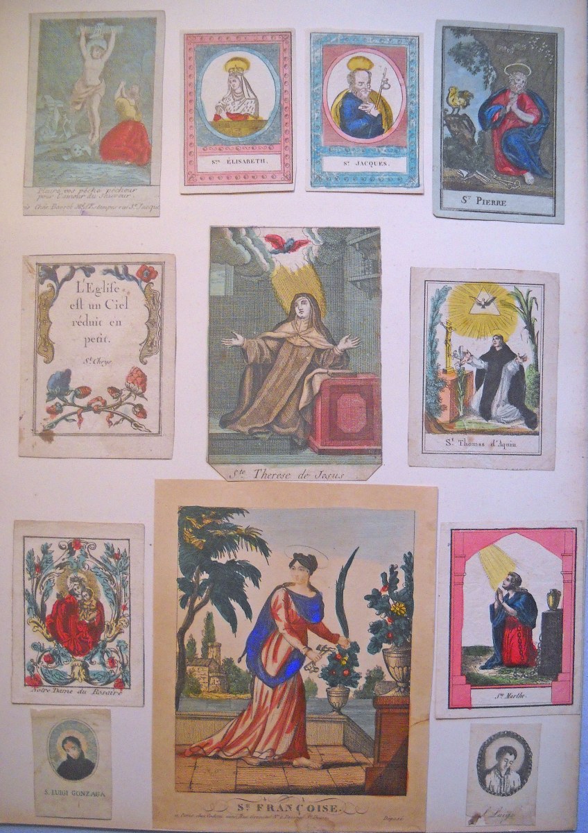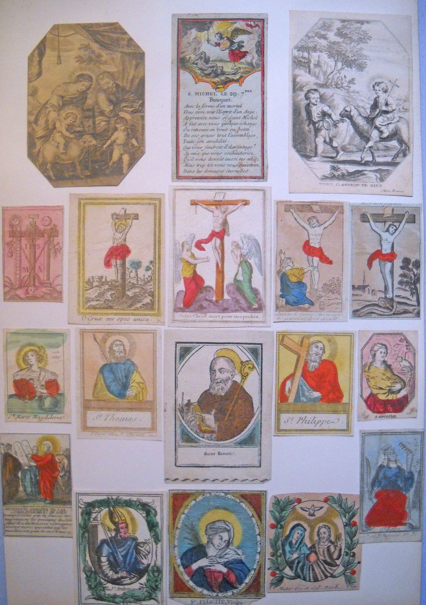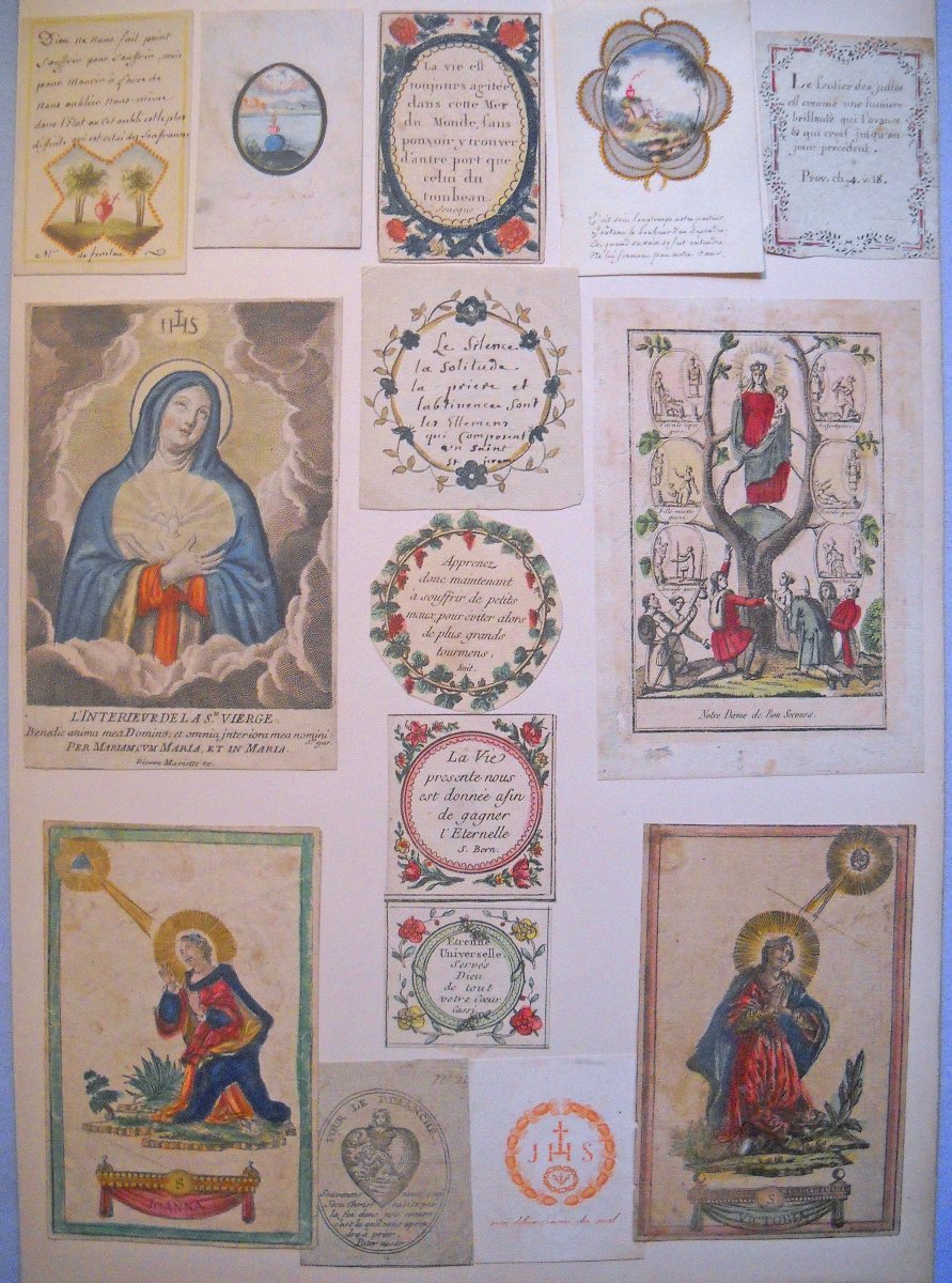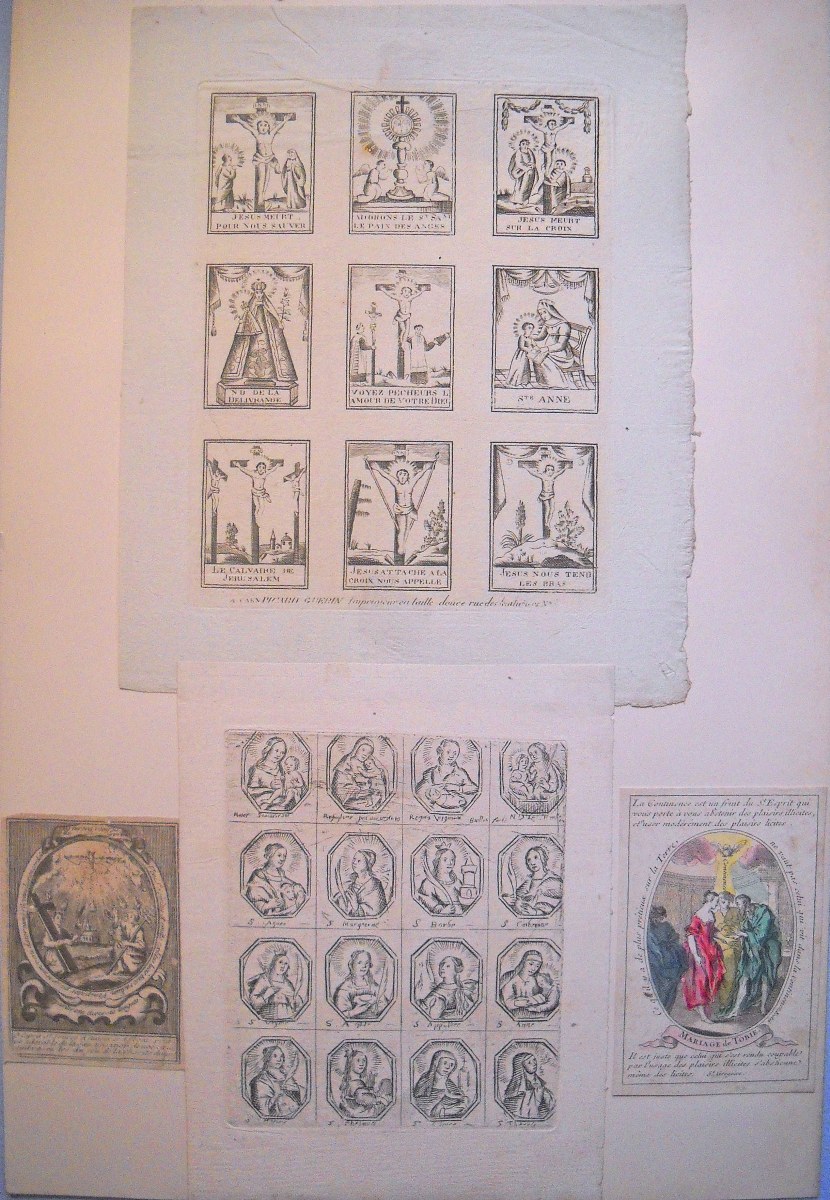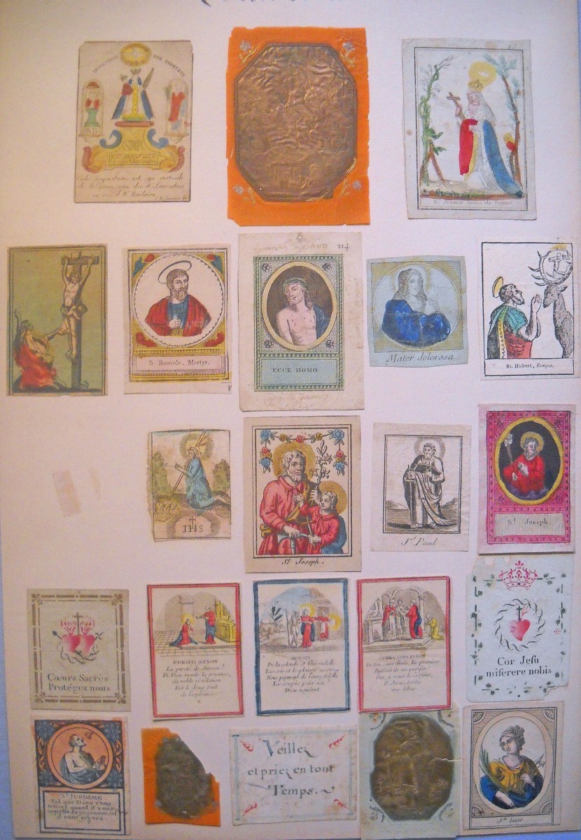 + de 390 images pieuses, en majorité gravure sur cuivre à rehauts polychromes, et quelques pièces entièrement peintes, sur papier vergé, vélin et parchemin. Dont suite de 15 p. Les stations de N.S. en sa passion par Antoine Boudet à Lyon ; maximes et dons ; vignettes ; Notre-Dame de Hanswijk à Malines ; L'intérieur de la Ste Vierge par Pierre MARIETTE ; Notre Dame de Bon Secours ; planche de scènes bibliques en taille douche chez PICARD GUERIN à Caen ; S. Bambino Di Aracoeli ; diverses représentations du Saint Suaire de Besançon dont impression tissée, etc. Contrecollées sur papier épais.